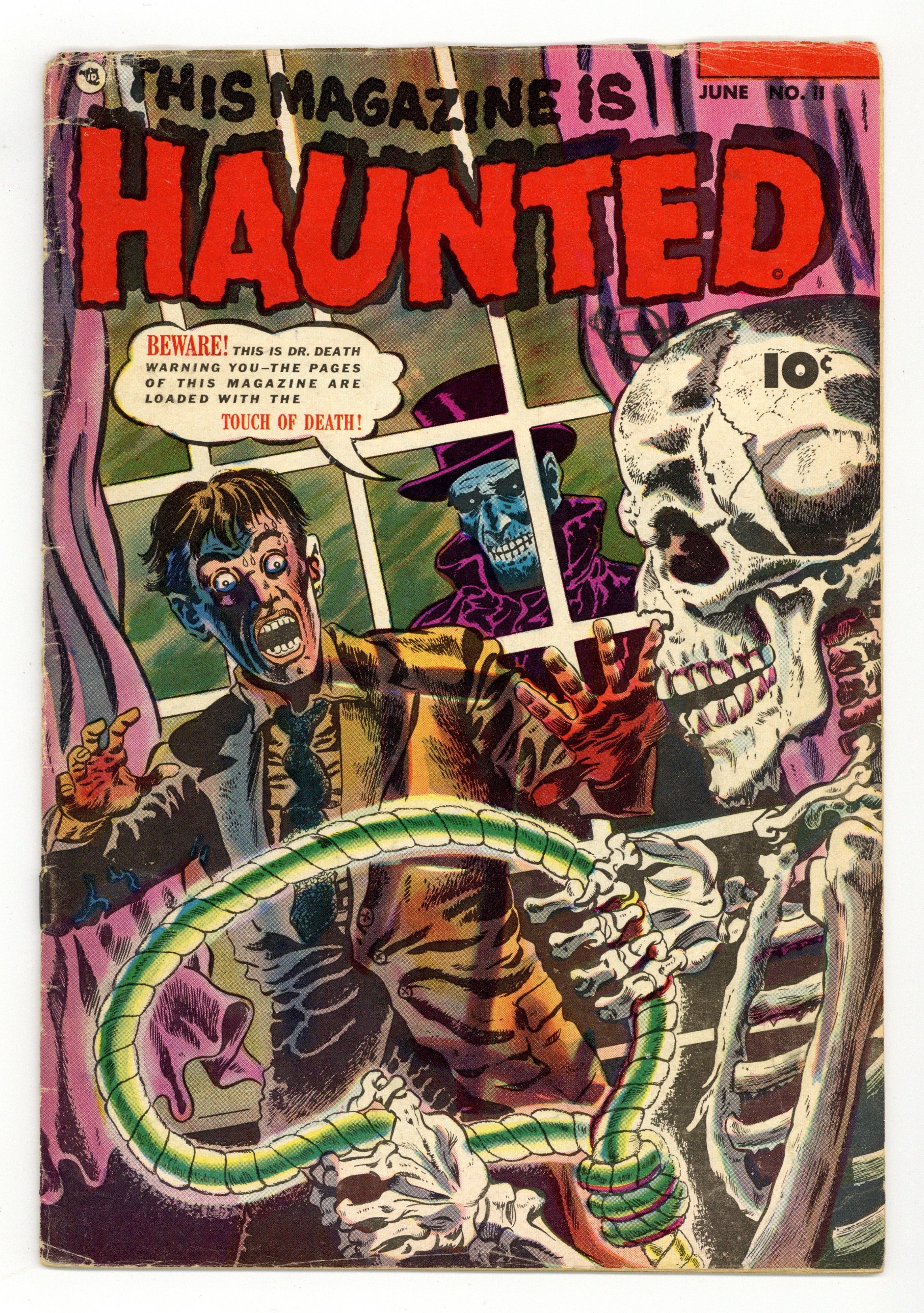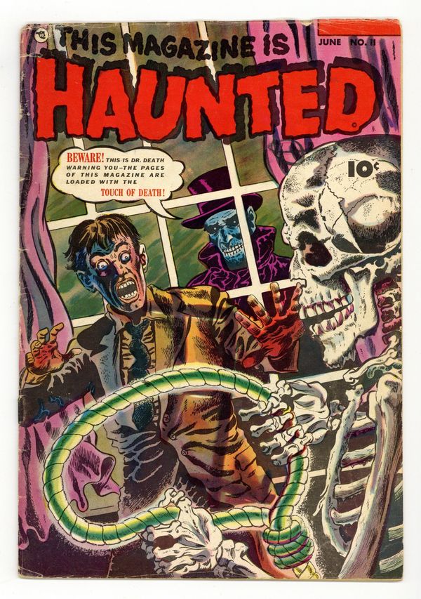 Edited by Will Lieberson and V.A. Provisiero. Cover by Shelly Moldoff. Stories by unknown. Art by Bob McCarty, Leonard Frank, Bob Powell and unknown. Horror tales that are so scary they could only lead you to believe that This Magazine is Haunted! In this issue: Actor Raymond Lawrence is cheating on the many women he dates. When one of them commits suicide, her former boyfriend swears revenge and builds a female robot...with the mission to search and destroy in "Lover"! Plus: Psychiatrist helps man overcome his delusion of turning into a bat in "And Then What????" with art by Bob McCarty. Also: Host character Dr. Death actively stars in this story as a satanic magician fulfilling wishes -- with a catch, of course -- in "The Bags of Trouble" with pencils by Leonard Frank. And: The age-old witch Mudga is cursed with the ability that anything that comes in contact with her is killed instantly. She's trying to live a reclusive life, but townsfolk just won't leave her be in "Touch of Death" with art by Bob Powell. Plus: 2-page text story "Vendetta" written by John Martin, and ads for Terror Tales and Worlds of Fear. 36 Pages, Full Color. Cover price $0.10.