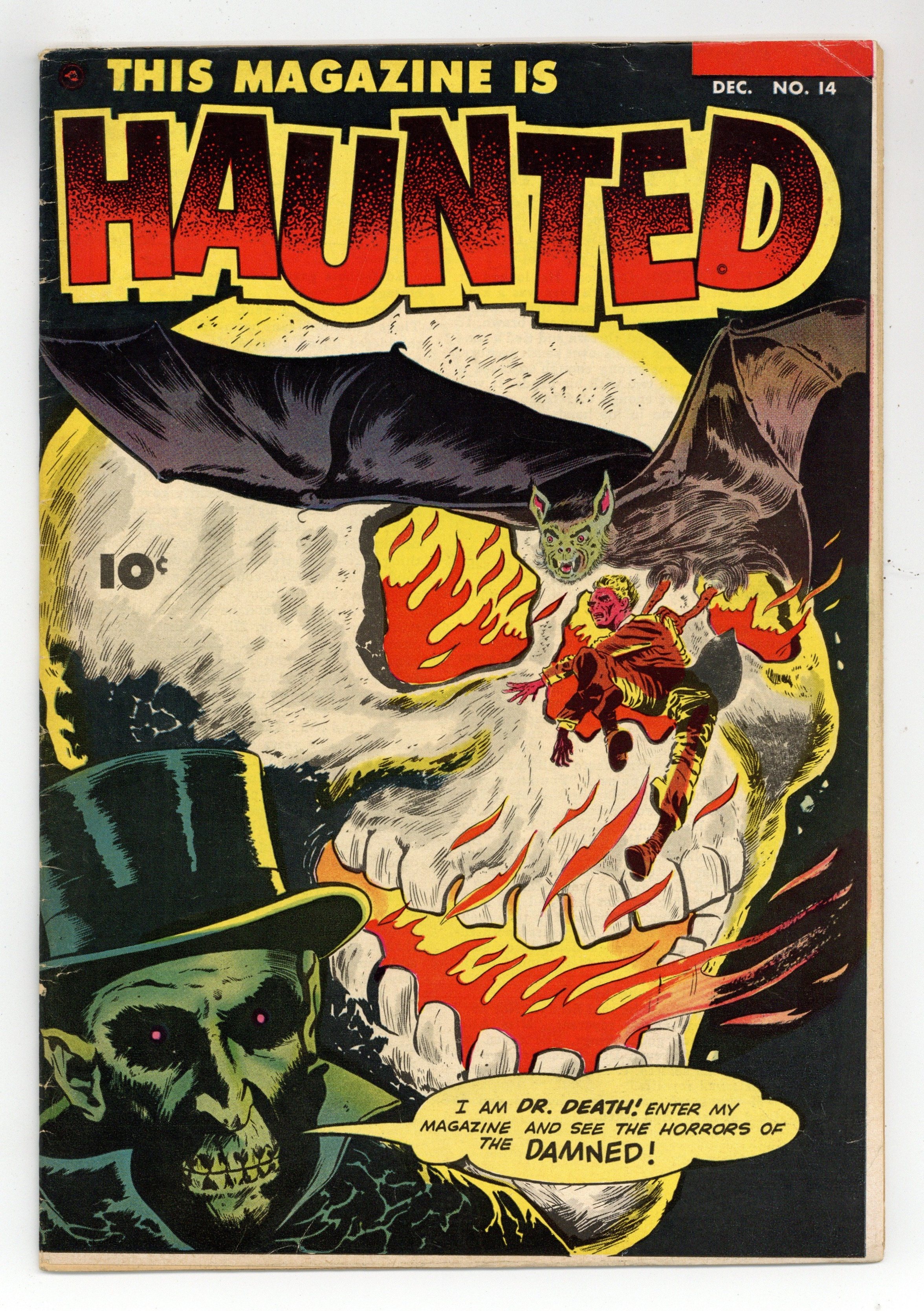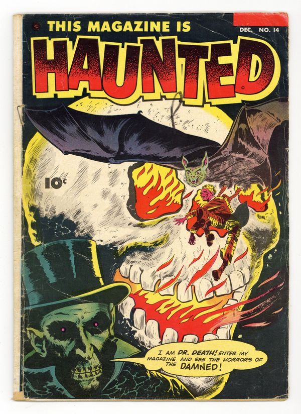Edited by Will Lieberson and V.A. Provisiero. Stories by Bill Woolfolk and unknown. Art by Bud Thompson, Rocco "Rocke" Mastroserio and unknown. He is Dr. Death! Enter his magazine and see the horrors of the damned! Horror tales that are so scary they could only lead you to believe that This Magazine is Haunted! In this issue: When Steve Drummond freakishly survives a suicidal jump, he finds out that men are not masters of their destiny, but mere puppets engineered by a race of supernatural demons called Ids. Drummond tries to go up against them and make others realize the horrible truth in "The Greatest Secret on Earth"! Plus: Barber Louie is ridiculed by his customers for his baldness. So he makes a wig out of the fast-growing hair of a werewolf he kills in his shop. The werewolf wig however keeps growing and attacks Louie in "The Wig" with art by Bud Thompson. Also: A party of big game fishermen goes after the famous "enchanted marlin." When they finally encounter the murderous specimen, a battle over life and death ensues in "Death Fish" by Bill Woolfolk and Thompson. And: Tyler Spence inherits the home of his aunt, but has to take care of her many cats. Aunt Tabitha however returns in the shape of a gray cat and takes revenge upon her nephew, who willingly let her die, in "Gaunt Gray Cat" with inks by Rocco "Rocke" Mastroserio. Plus: 2-page text story "Heart of Ice" written by John Martin, and 1-page stories "The Legend of Glamis Castle" and "The Devil's Soul"! 36 Pages, Full Color. Cover price $0.10.