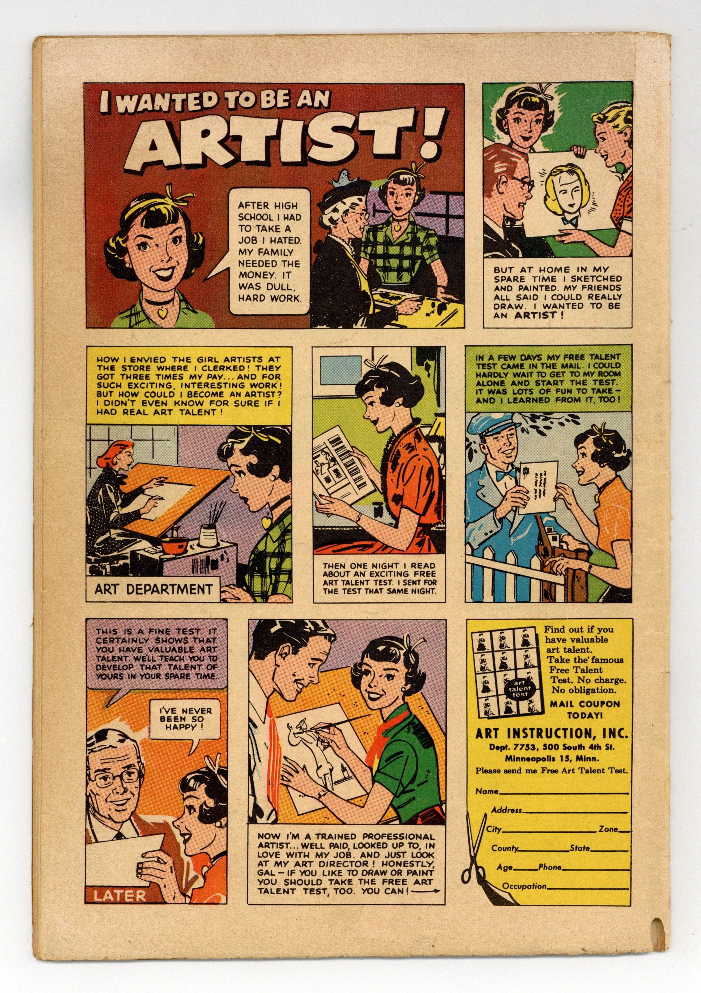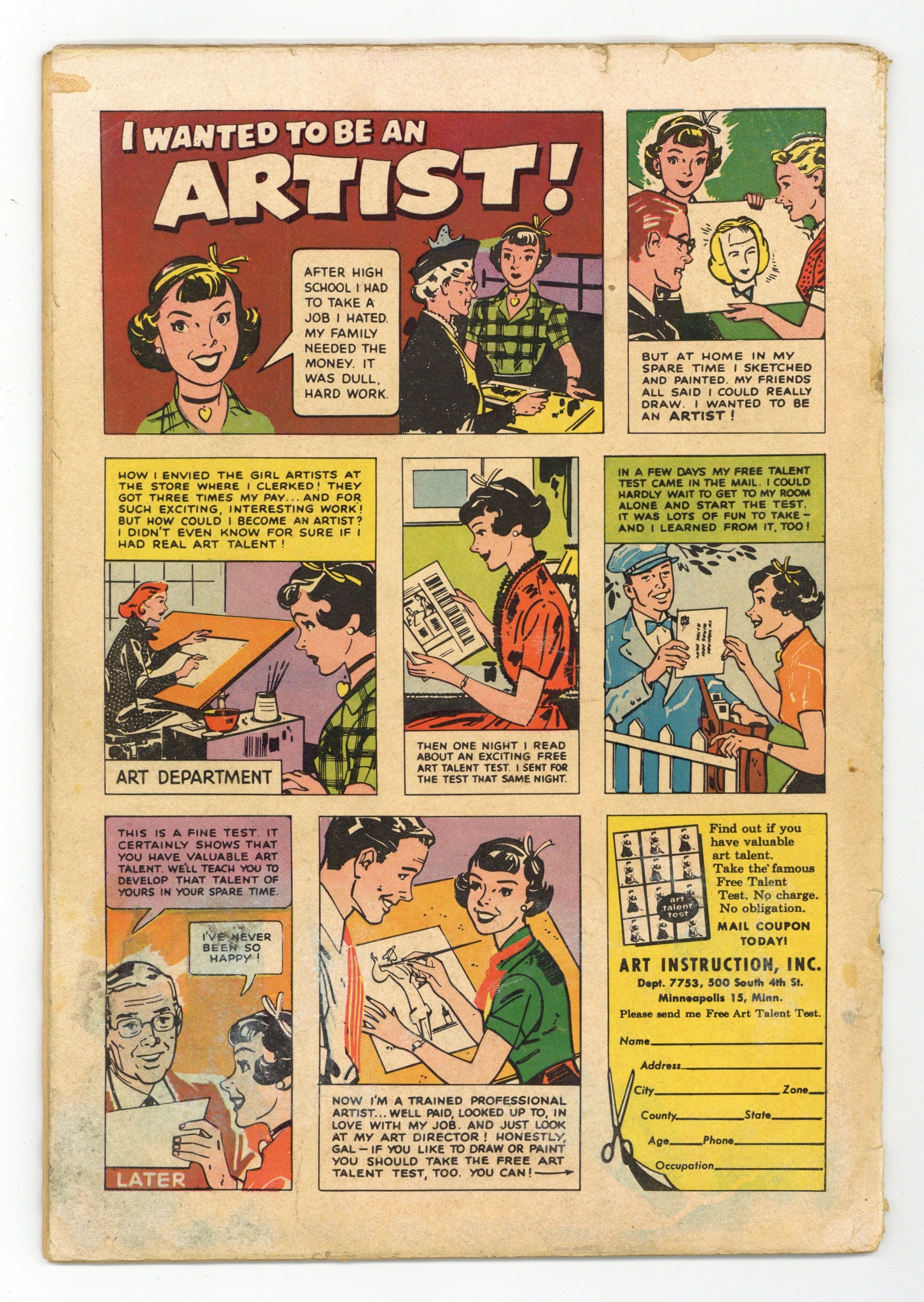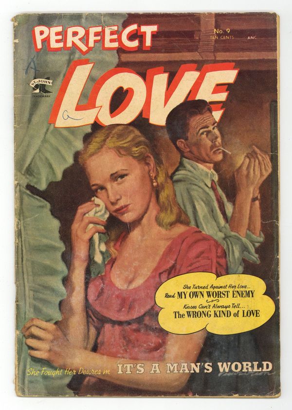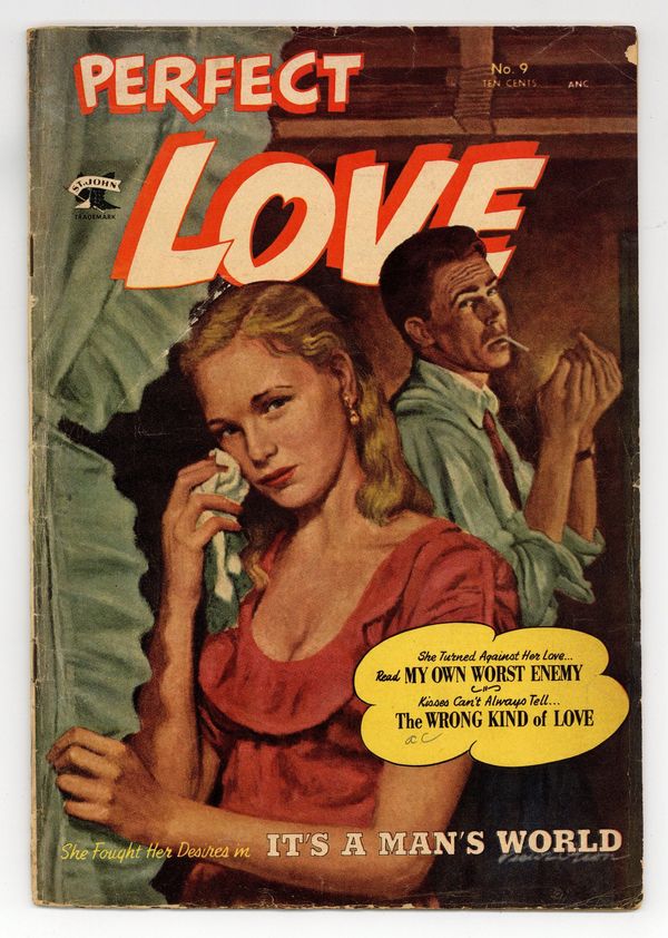 Painted cover art. "I Was My Own Worst Enemy"; Jan loves Lance even though he refuses to hire her at his architectural firm; She goes to work for his rival Fred and steals confidential information from Lances office to win a contract; Lance finds out and breaks up with her; Jan discovers shes in over her head on the job and asks Lance for help. "Adios, My Love"; Conchita convinces her father to send her to university in the USA, over the objections of her fiancé Manuel; She falls in love with Johnny there, but has to go home when her father is killed. "Wrong Kind of Love"; Artist Josh gets a scholarship to study in Paris and wants to marry Ava so she can come with him; However, her widowed mother opposes the match, preferring local businessman Herb for her daughter. "Dream Man" cartoon page, scripts and art by Merrylen Townsend. "I Ran Away from Love" text story by Dana Dutch. "It's a Man's World"; Laurie, an employee of a corrupt political "machine," urges her boyfriend Guy not to run as the partys mayoral candidate; When he does, Laurie embarrasses him at a rally and is selected by the reform Citizens Party as his opponent; Guys party reveals that Laurie was once in reform school, so Guy quits the ticket. 36 pgs., full color. Cover price $0.10.