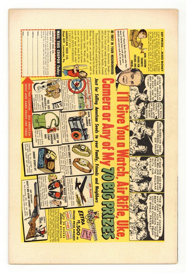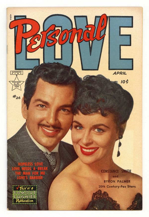 Cover photo of Constance Smith and Byron Palmer from the movie "Man in the Attic." Stories and art by Mike Roy, Jack Berrill, Jerry Fasano and Bill Ely. Romance comics and movie stars of yesteryear from Famous Funnies. Ted feels humiliated when Lorna rescues him from a skiing accident, instead of the other way around; Diane dates a dashing older man and ignores handsome co-worker Roger; Bette feels that Guy's devotion to his mother stands in the way of their marriage. Hopeless Love; Love Needs a Break; The Man for Me; Loves Barrier; My Date; When You Give ...You Are There; New-Exciting-Star Byron Palmer "Our Cover Man"; Exciteable, Likeable Constance Smith "Our Cover Girl". 36 pages, Full Color. Cover price $0.10.