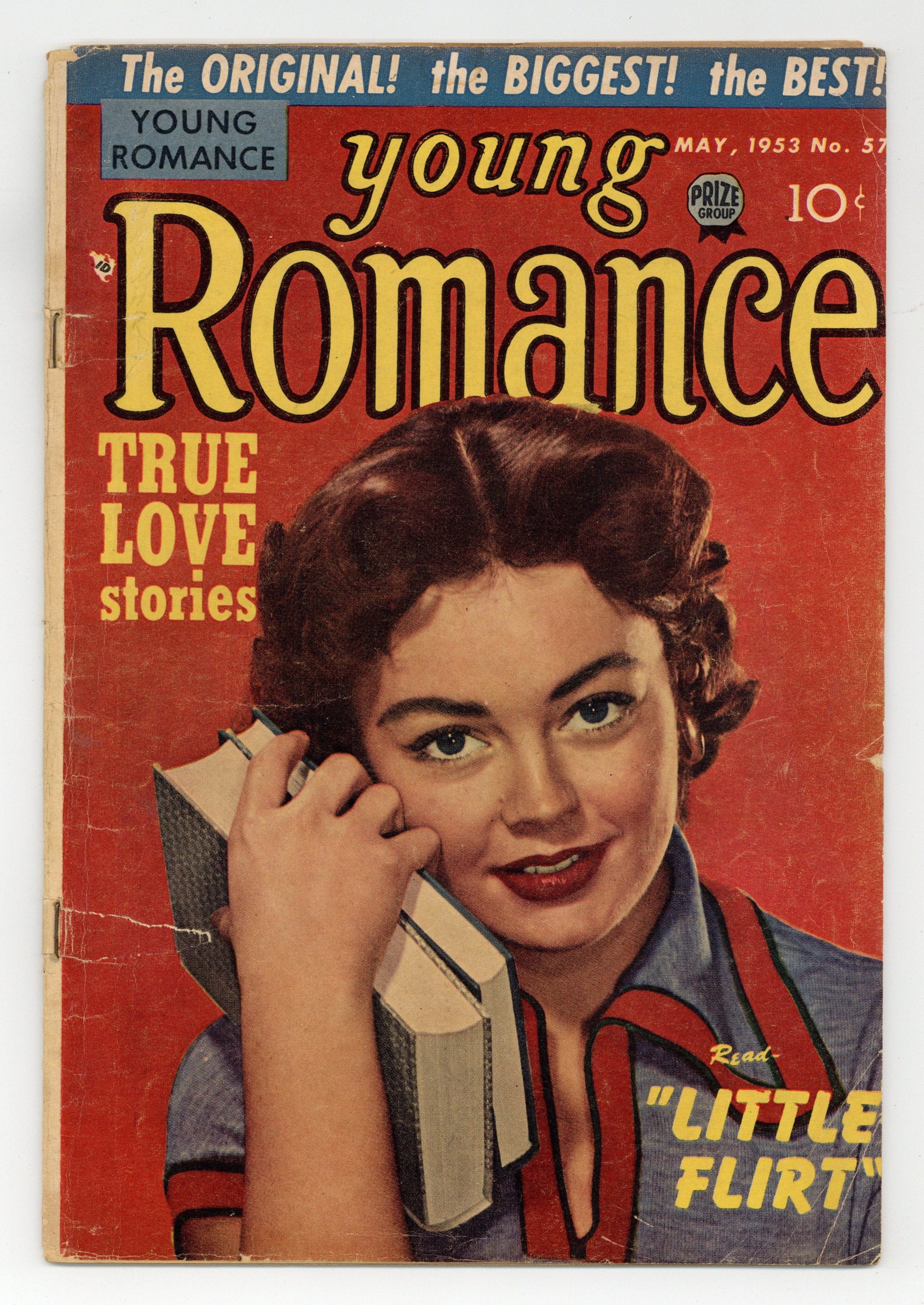 #57 on cover; Vol. 6 No. 9 in indicia. Art by Jack Kirby and others. The famed title that spawned a decades-long trend in romance comics, created and produced by Captain America creators Joe Simon and Jack Kirby. #57 on cover, Vol. 6 No. 9 in indicia. Cultures clash when American soldier Neil is torn between German Ilse and Helen, his sweetheart from back home. The legend of Lover's Leap in Connecticut, where star-crossed lovers met their deaths after being forbidden to marry. Marcy has a summer fling with Tom, but he follows her back to the city and tries to convince her to marry him. The Underdog; Nancy Hale's Problem Clinic; The Extra Touch; Peeping Tom; Lover's Leap!; Strange Marriage Customs!; Too Young?; Little Flirt! 32 pages, Full Color. Cover price $0.10.