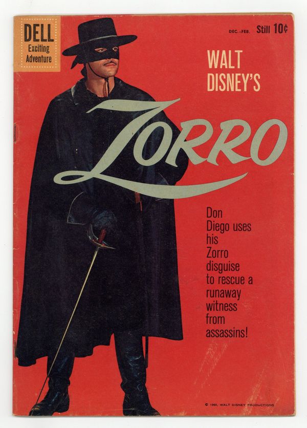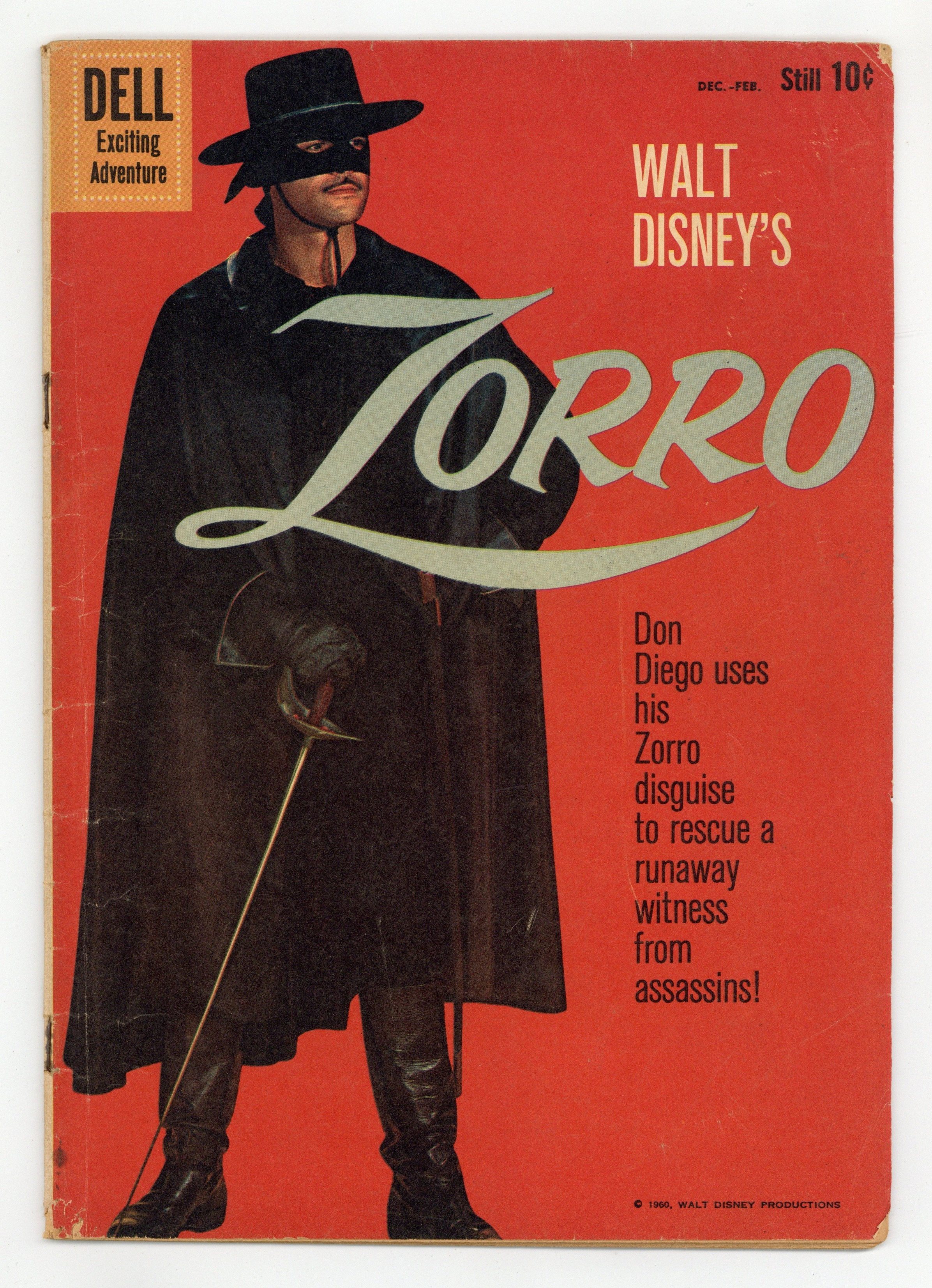 Art by Alex Toth and John Ushler. Photo cover features Guy Williams, star of Disney's Zorro TV series. Dell presents adventures of Johnston McCulley's masked avenger of Old California, based on the hit Walt Disney TV series. Zorro tries to protect a flower seller who witnessed a murder, shedding his mask to join her on a cross-country journey as Don Diego. Zorro acts to keep incompetent but useful Sergeant Garcia in his job. Alex Toth provides most of the art in this issue. The Runaway Witness; Land of Gold and Sunshine; The Padre's Welcome; Friend Indeed; Senor Gomez Hunts a Fox; Smugglers' Haven; Clash With Diego. 36 pages, B&W. Cover price $0.10.
