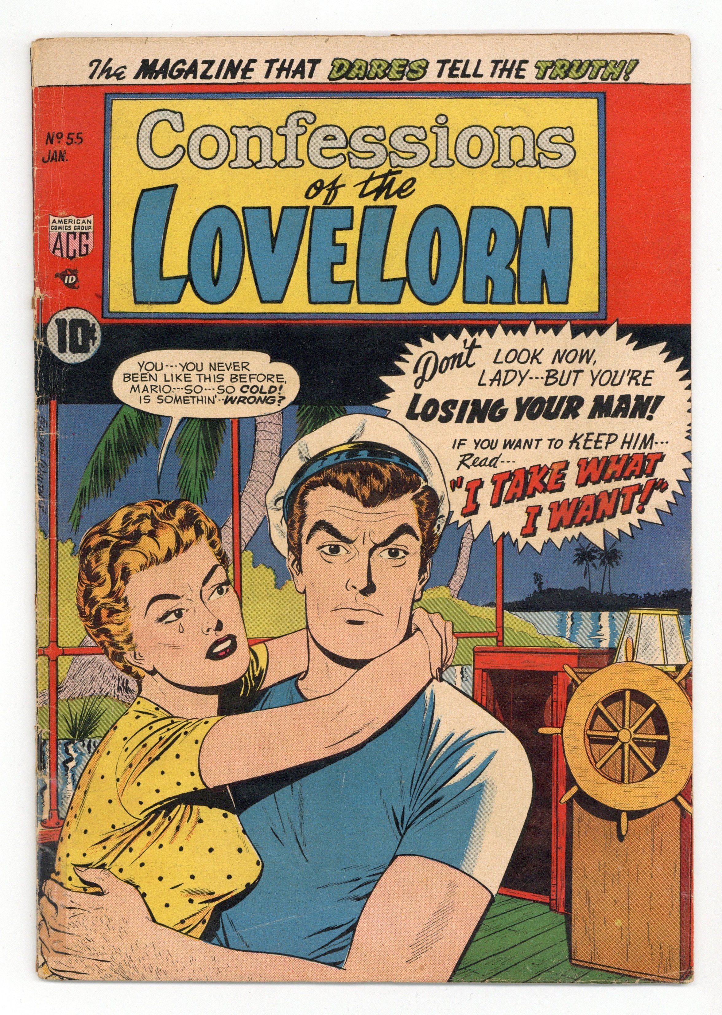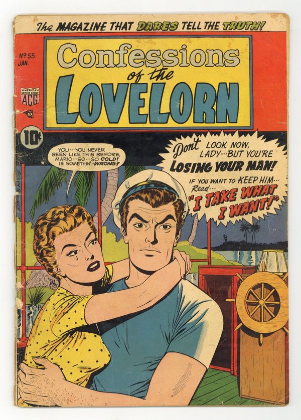 Cover by Ogden Whitney. Edited by Richard E. Hughes. Stories by unknown. Art by Ogden Whitney, Kenneth Landau and unknown. The magazine that dares tell the truth! In this issue: Mario's never been like this before -- so cold! Was something wrong? Don't look now, lady, but you're losing your man! If you want to keep him, read..."I Take What I Want!" with art by Ogden Whitney. Plus: 1-page text story "No Time for Girls!"; 2-pager "A Close Shave with Love"; "The Greater Love!"; 1-page text story "It's a Great World!"; and "Illusion and Reality" with art by Kenneth Landau. 32 pages, full color. Cover price $0.10.
