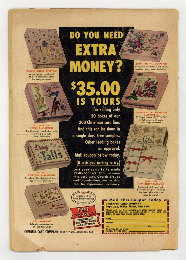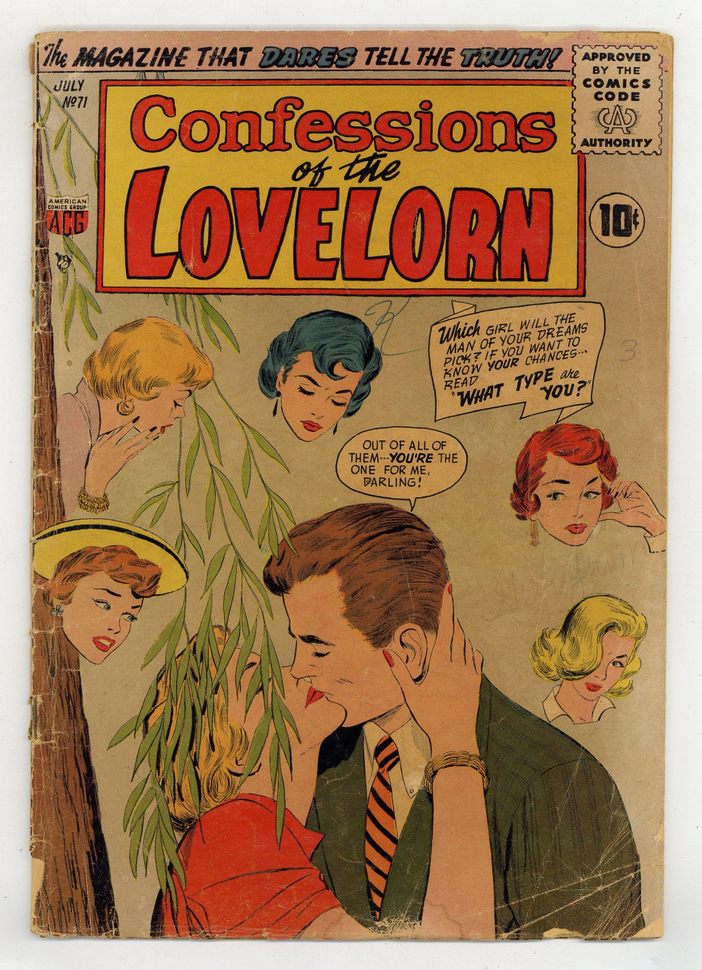 Edited by Richard E. Hughes. Art by Harry Lazarus and others. Tales of romance from legendary early independent comics publisher ACG, one of the earliest of the romantic comics genre of the postwar era. Childhood friends Jane and Phyllis compete for the same man in adulthood; Advice on becoming the type of woman men will like; Wendy falls for a failed writer, and cant get him out of her mind after her own fortunes change. Love Thief!; Flowers for Romance; What Type Are You?; What's Morse Code for Love?; I Loved a Failure!; Kid Sister! 32 pages, Full Color. Cover price $0.10.
