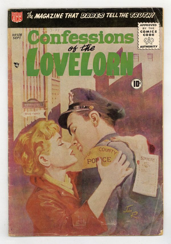 Painted cover by John Rosenberger. Edited by Richard E. Hughes. Stories by Richard Hughes. Art by John Forte and Bill Everett. Tales of romance from legendary early independent comics publisher ACG, one of the earliest romantic comics of the postwar era. Millie falls for the police officer who keeps writing her tickets; A can-do cowgirl falls for a handsome New Yorker; Lila is alarmed when Eric throws firecrackers at her, but it turns out he has a good reason. Millie and the Cop!; The Beachcomber; I Can Do Better!; Smart Sister; Love Is an Explosive Thing!; Research in Romance! 32 pages, Full Color. Cover price $0.10.
