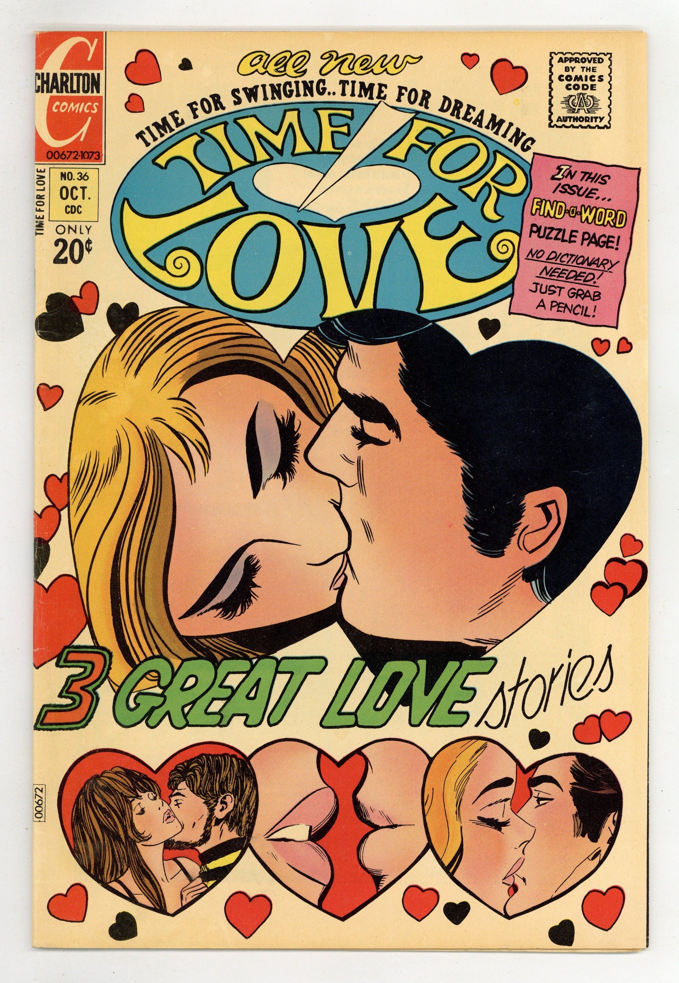 Cover by Luis Avila, Art Cappello, Charles Nicholas and Vince Alascia. Stories and art by Luis Avila, Art Cappello, Charles Nicholas and Vince Alascia. Couples navigate the mazelike pathways of relationships and love in the 1960s and '70s. Beautiful Vikki has so many men fall in and out of love with her, she doesn't know the real thing when it's right in front of her. Angela's day goes from bad to worse when she loses her wallet and get stranded in Washington DC... and then she meets Phil, in a story featuring some good-girl art. Up-and-coming actress Ginger is torn between her career, her boyfriend Jim, and her handsome manager Barron. Plus romantic advice. Always in Love!; Cry Over Me!; Find-a-Word; Teen-Age Troubles; Betrayed by a Kiss! 32 pages, Full Color. Cover price $0.20.