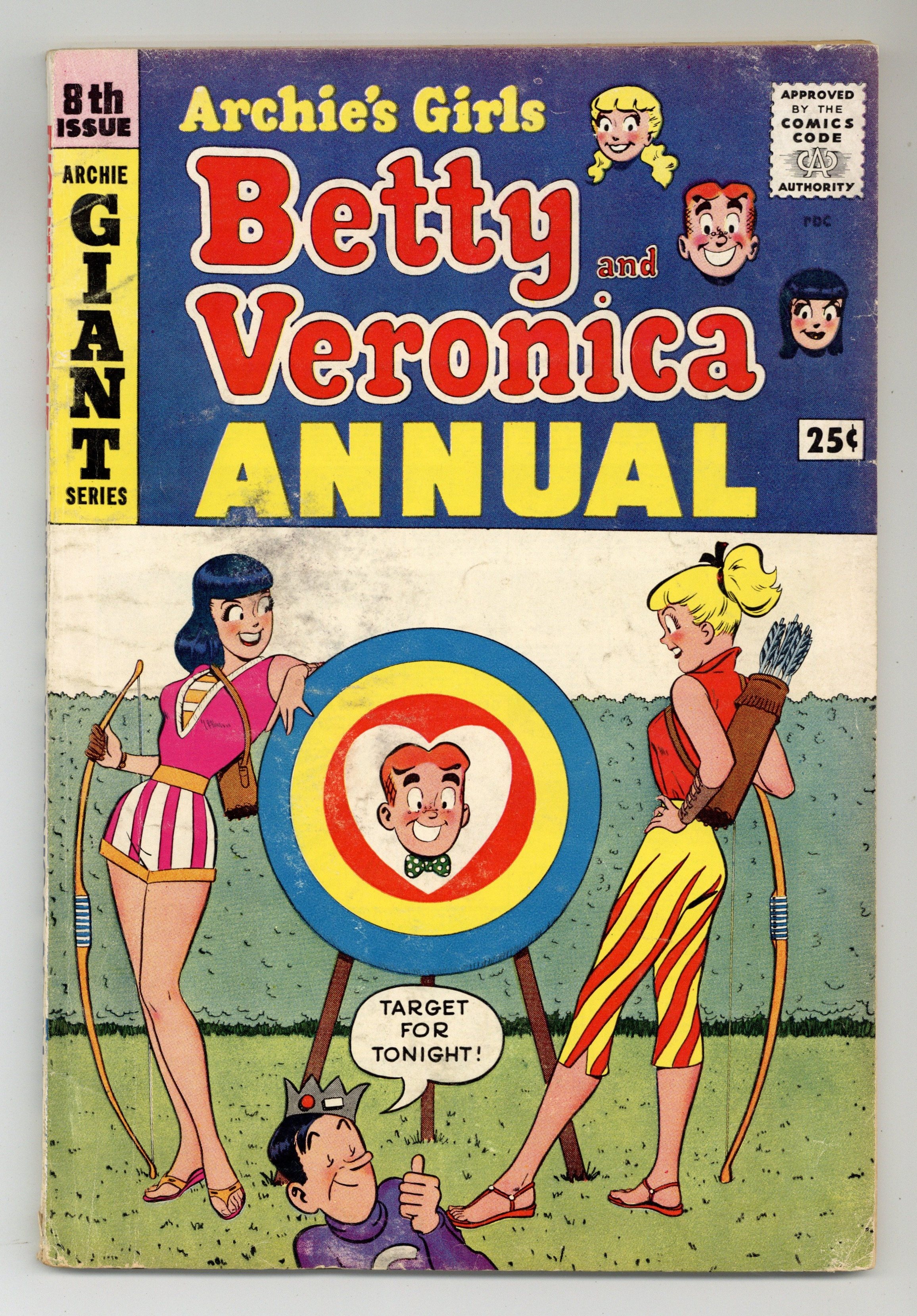 Cover pencils by Harry Lucey, inks by Terry Szenics. "Sweet Sorrow," script by Frank Doyle, pencils by Dan DeCarlo, inks by Rudy Lapick; When Veronica shows Betty a new dress she bought, Betty becomes despondent because Veronica has so much more than she does. "The Kiss-Off," script by Frank Doyle, pencils by Dan DeCarlo, inks by Rudy Lapick; Betty has won a prize of ten kisses from Archie, which she can collect one at a time at any time she wants. "Cleaned Up!" one-page Li'l Jinx story by Joe Edwards. "Cooking Caper," pencils by Dan DeCarlo, inks by Rudy Lapick; Betty and Veronica overhear Archie and Jughead making nasty remarks about their cooking, and are determined to prove them wrong. "Puttin' On the Dog!", script by Frank Doyle, pencils by Dan DeCarlo, inks by Rudy Lapick; Archie and Veronica try to get an invitation to the home of Calvin Colcash, a man even richer than Mr. Lodge. "Show Biz," script by Frank Doyle, pencils by Dan DeCarlo, inks by Rudy Lapick; Archie has promised to take Betty anywhere she wants for her birthday, but when she wants to go to the carnival, he says no, driving her into despair over his broken promise. Article on James Garner. "The Conquest," script by Frank Doyle, pencils by Dan DeCarlo, inks by Rudy Lapick; Betty and Veronica both go to extremes trying to chase after a handsome new boy. "A Choice Choice," script by Frank Doyle, pencils by Dan DeCarlo, inks by Rudy Lapick; To take his mother out on her birthday, Archie has to break a date with Veronica; Afraid to break the date, Archie tells Ronnie he's sick. 84 pgs., full color. Cover price $0.25.
