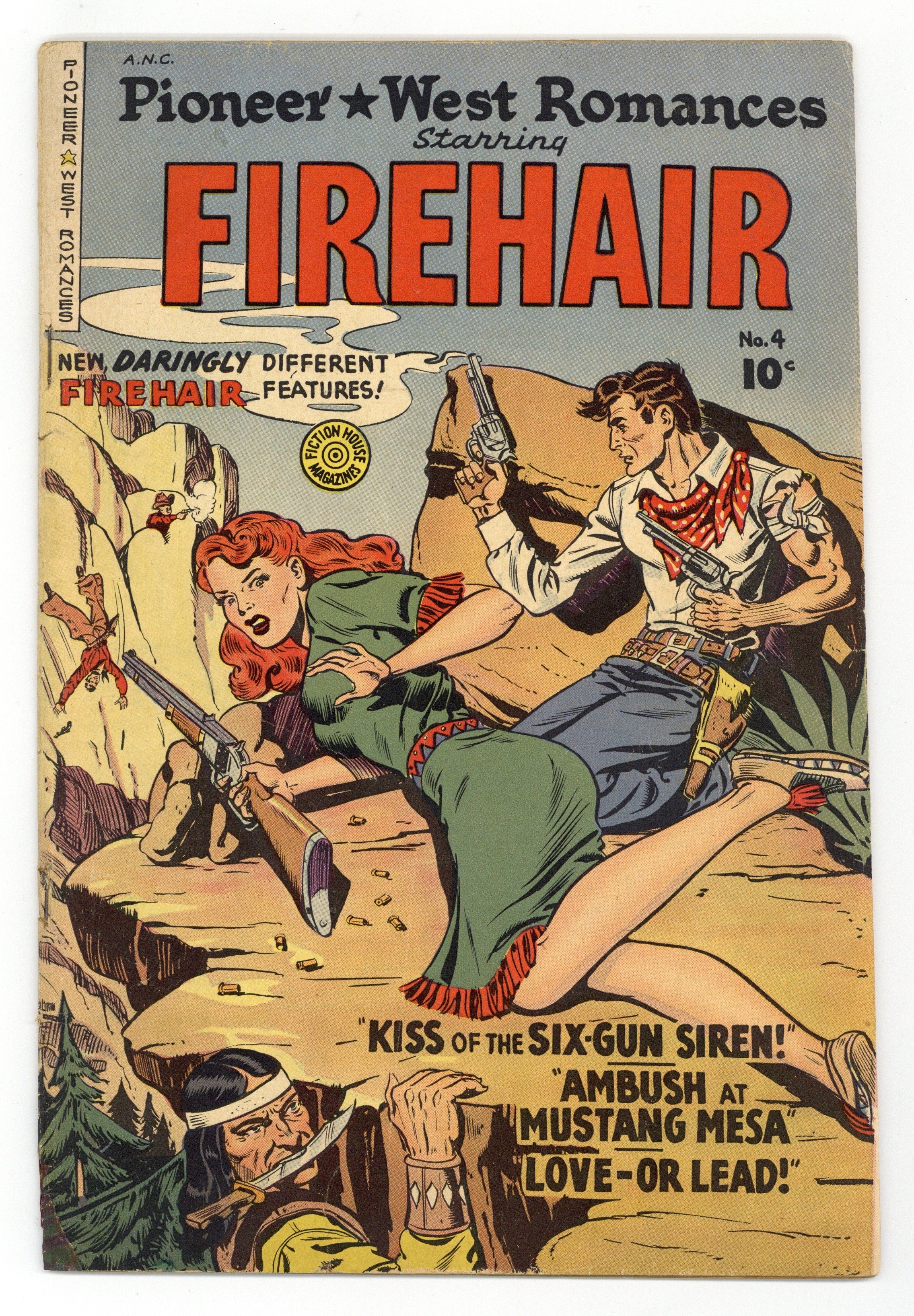 Stories by John Mitchell, credited as John Starr. Art by Robert Webb and David Heames. Cover by Jack Kamen. Adventures of the Western hero Firehair, a white woman raised by the Dakota tribe. A white man gets the Mandan tribe to dress as Dakotas for a stage robbery; Firehair intervenes when a prospector is tricked into digging in Dakota burial grounds; Crooked traders plan on muscling in on the fur-trade business. Kiss of the Six-Gun Siren; Ambush At Mustang Mesa; Love Or Lead. 32 pages, Full Color. Cover price $0.10.
