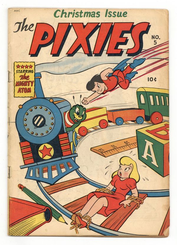 Published Dec 1948 by Magazine Enterprises.$70.00Kids' comics from Magazine Enterprises. The tiny pixies who live in the town of Pixerary face danger from gigantic wildlife and rival pixies, but luckily they have their own superhero, The Mighty Atom. The Pixies face a host of underwater dangers when they create their own diving bell; The jealous Kixies set out to sabotage the Pixies' railroad; Tom the Jungle Boy attempts to build his own ark, just like Noah. The Corn Cure; Repel Ray Gun; Weeds In Need; This Is a Stick Up!; Tom-Tom the Jungle Boy; The Pixie's First Railroad; Pic-Puzzle Page. 32 pages, Full Color. Cover price $0.10.
