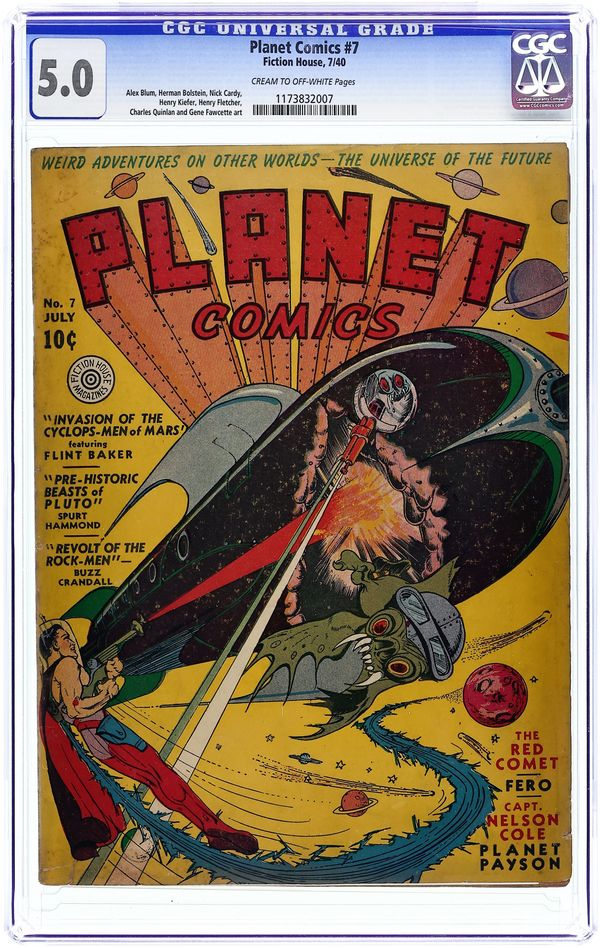 Cover by Bob Powell. Edited by Malcolm Reiss, Jerry Iger and Will Eisner. Stories and art by Alex Blum, Fletcher Hanks, Arthur Peddy, Witmer Williams, Henry C. Kiefer, and Charles M. Quinlan. The first true science fiction comic, Planet Comics featured classic space opera with square-jawed heroes, rockets, rayguns and bug-eyed aliens of every stripe. Buzz Crandall battles Lepus the Fiend, in a story by legendary oddball cartoonist Fletcher Hanks; Magical space superhero The Red Comet faces the creatures known as The Stickers; Spurt Hammond, the defender of the Planet Venus, repels an invasion by The Rock Men of Jupiter. Early cover by Bob Powell. The Red Comet; Captain Nelson Cole; Auro Lord of Jupiter; The Rockmen of Jupiter; Buzz Crandall of the Space Patrol; Lost World of Time; Fero Interplanetary Detective; The Menace of the Magno-Universe; Crash Barker and the Zoom Sled; Planet Payson; Invasion of the Cyclops-Men of Mars. 68 pages, full color. Cover price $0.10.