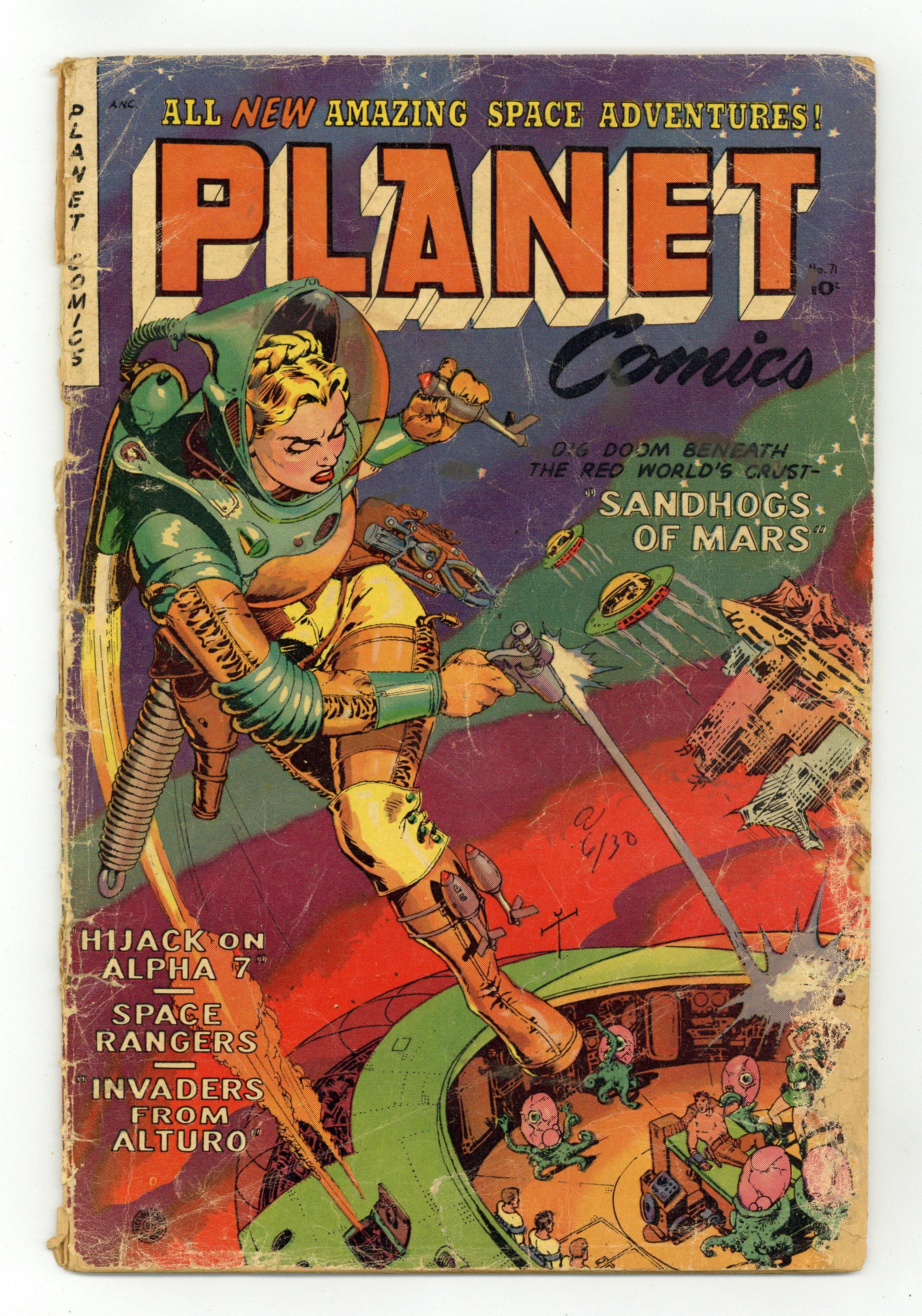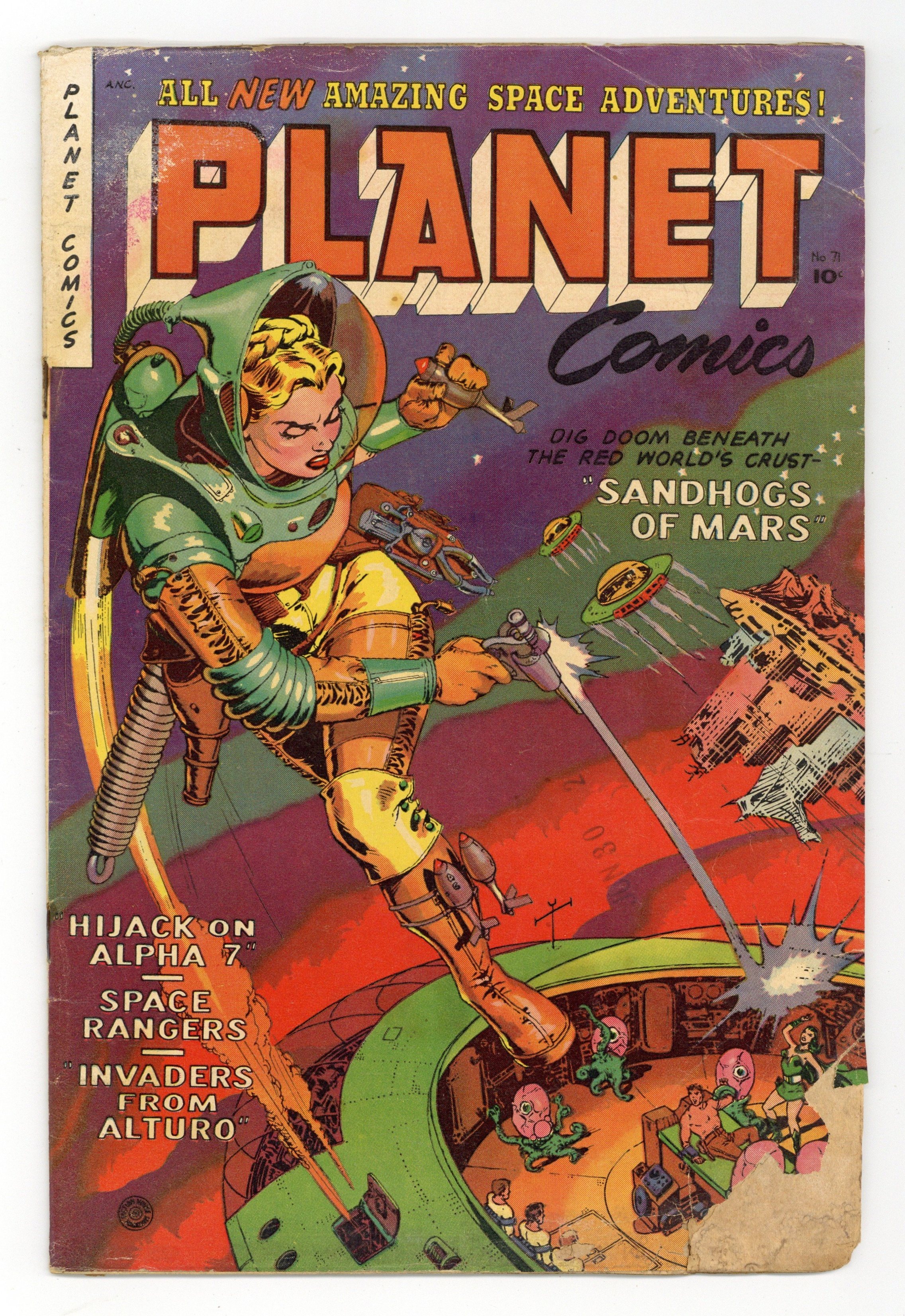 Cover art by Maurice Whitman. Invasion? story, art by John Belcastro. The Sandhogs of Mars story, art by Maurice Whitman. The Changelings starring Space Rangers, inks by Bernard Sachs. Silence From Planetoid X, art by Bill Discount. Hijack On Alpha-7 story, pencils by Bill Benulis, inks by Jack Abel. 36 pgs. $0.10. Cover price $0.10.