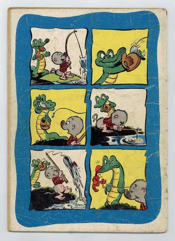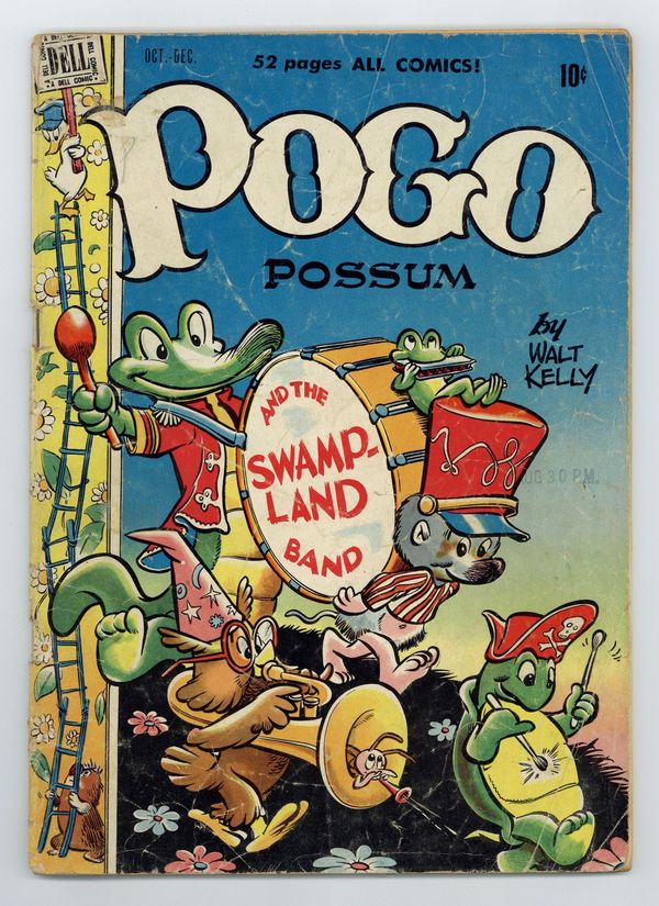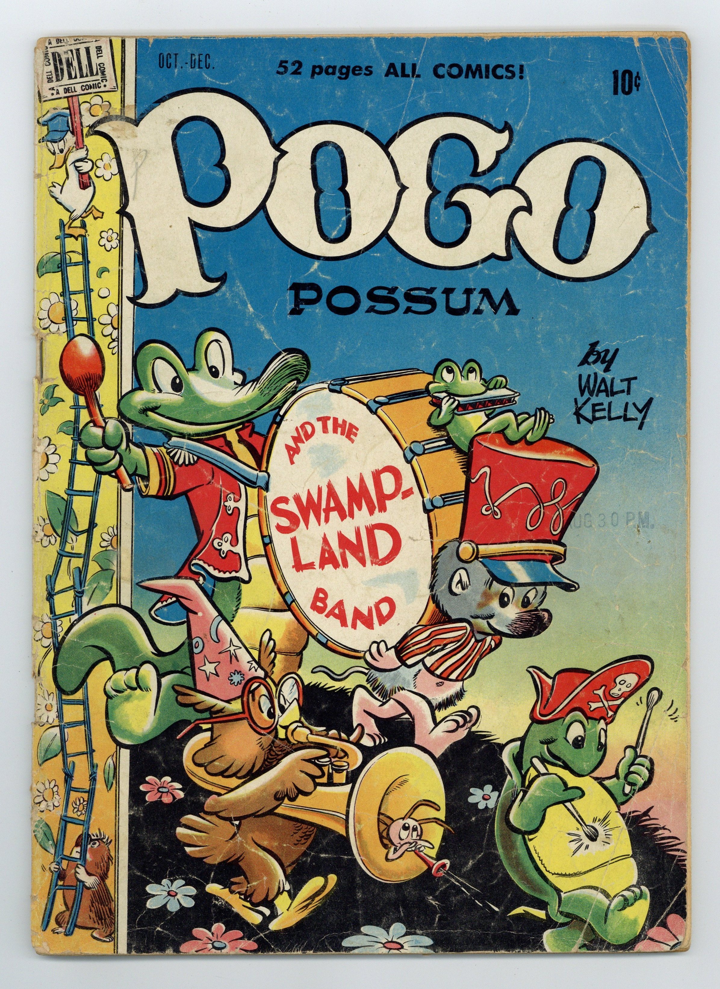 Cover art by Walt Kelly. Scripts and art by Walt Kelly. "The Great Two-Gun Fiasco"; Spoof western; Albert and Pogo ride to the aid of Soft Shell, using Beauregard and Barnstable as horses; A shootout occurs at Porkypine's hideaway. "How Come That Showboat?"; Churchy and Toadie cheat Pogo out of his lunch, after which Pogo joins Albert in a showboat cabaret performance. "The End of the Rainbow"; Mose, posing as Pogo, tells Rackety Coon Chile about the gold at the end of the rainbow; Albert and Howland are listening in, and when Pogo and Churchy fire rockets and flares, are convinced they see a rainbow. Untitled one-page story; The beetles use Beauregard's head for a springboard. Untitled one-page story; Albert prepares to steal Pogo's freshly caught fish. 52 pages, full color. Cover price $0.10.