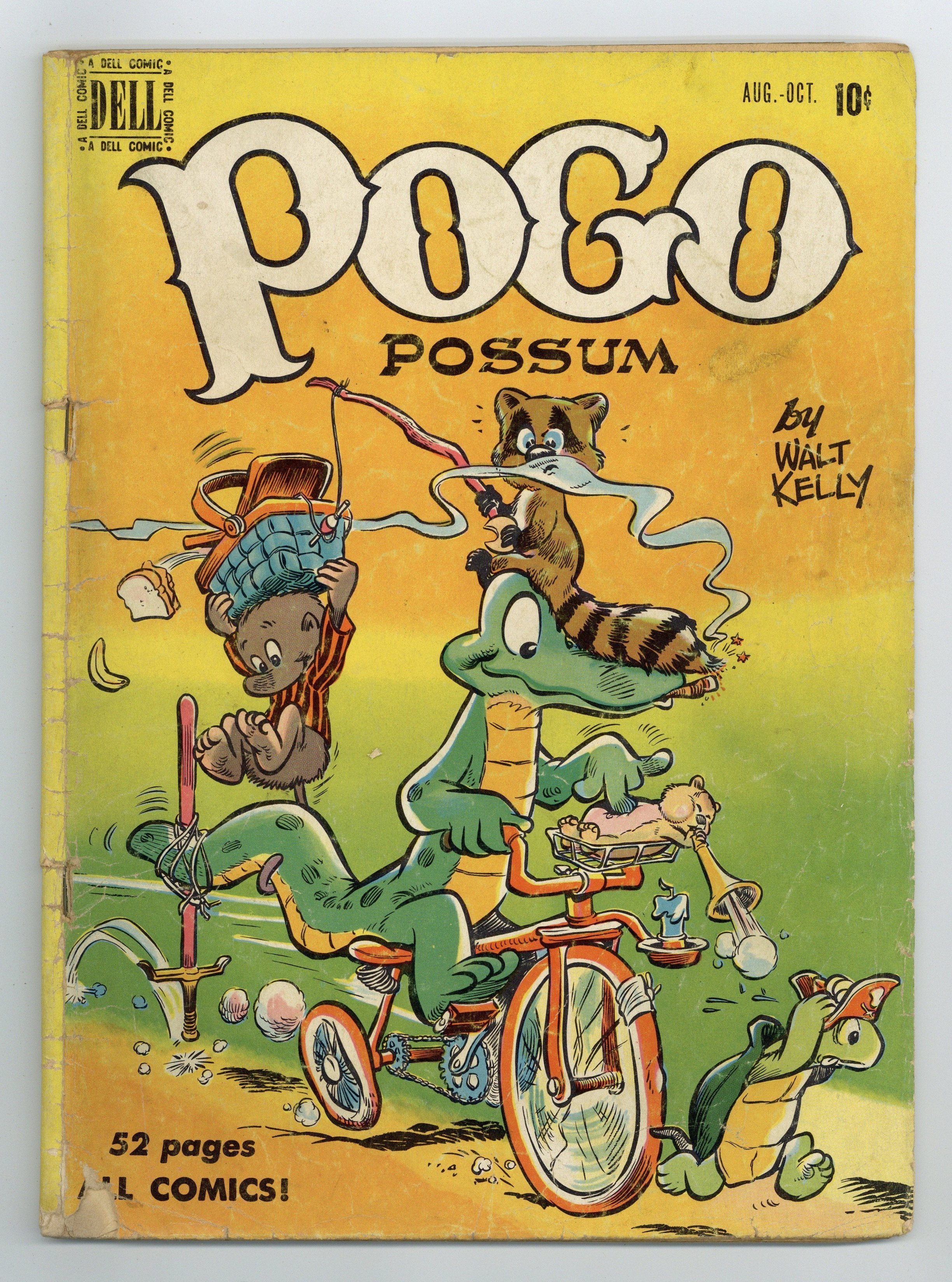Cover art by Walt Kelly. Scripts and art by Walt Kelly. Untitled one-page story; Churchy of the fire brigade brings marshmallows to the fire. "The Deep Freeze"; Pogo tricks Albert into helping him dig sweet 'taters on the hottest day of the year; Due to very strange circumstance Churchy gets covered in honey and feathers, causing Pogo and Albert to think that a blizzard is on. "The Grasshopper and the Ant"; Pogo and the grasshopper watch the changing of the [ant] guard (quite literally), and trick the ant queen out of her sandwiches. "School for Mice"; Seminole Sam tricks Albert and Beauregard into joining his newly initiated School for Mice, making the way clear for Sam to rob Pogo's pantry. "Feelin' Mighty Hale, and Farewell"; Albert steals and eats a beehive, thinking it's a fish pie; Upon discovering that the pie was intended for the fish fry, he decides to take his own life, but Pogo saves him by pumping his stomach with the fire brigade's pulmotor. Untitled one-page story; Churchy dresses up in fireman's clothing for frying sausages. Untitled one-page story; Albert does hat tricks. 52 pages, full color. Cover price $0.10.