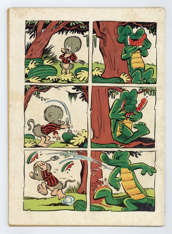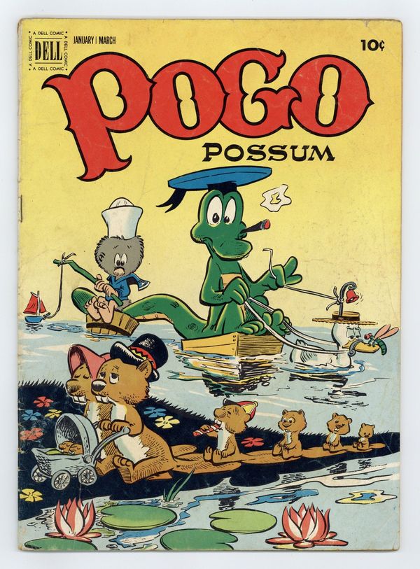 Cover art by Walt Kelly. Scripts and art by Walt Kelly. Untitled one-page story; Churchy painting a portrait of Pogo. "Cinderella and the Three Bears"; Albert telling the fairy tale of Cinderola to Pogo and the bug children, with Pogo acting as Cinderola, the three bears as Cinderola's stepmother and stepsisters, Churchy as the King's page, Howland as Cinderola's furry godmother, and Albert as the prince. "Berried Treasure"; The three children disguised as old men, try tricking a blueberry pie off Albert. "The Boastful Bird" text story. "The Big Rock Candy Quarry"; Rackety Coon Chile and Pogo find sheet music for the song "The Big Rock Candy Mountain" in Albert's trunk, and Albert sets out to find the mountain in order to become a millionaire; Seminole Sam sells him a pile of garbage, claiming it to be rock candy in disguise. Untitled one-page story; Churchy catches the frog's fishing hook. Untitled one-page story; Pogo mistakes Albert's tail for a water melon. 36 pages, full color. Cover price $0.10.