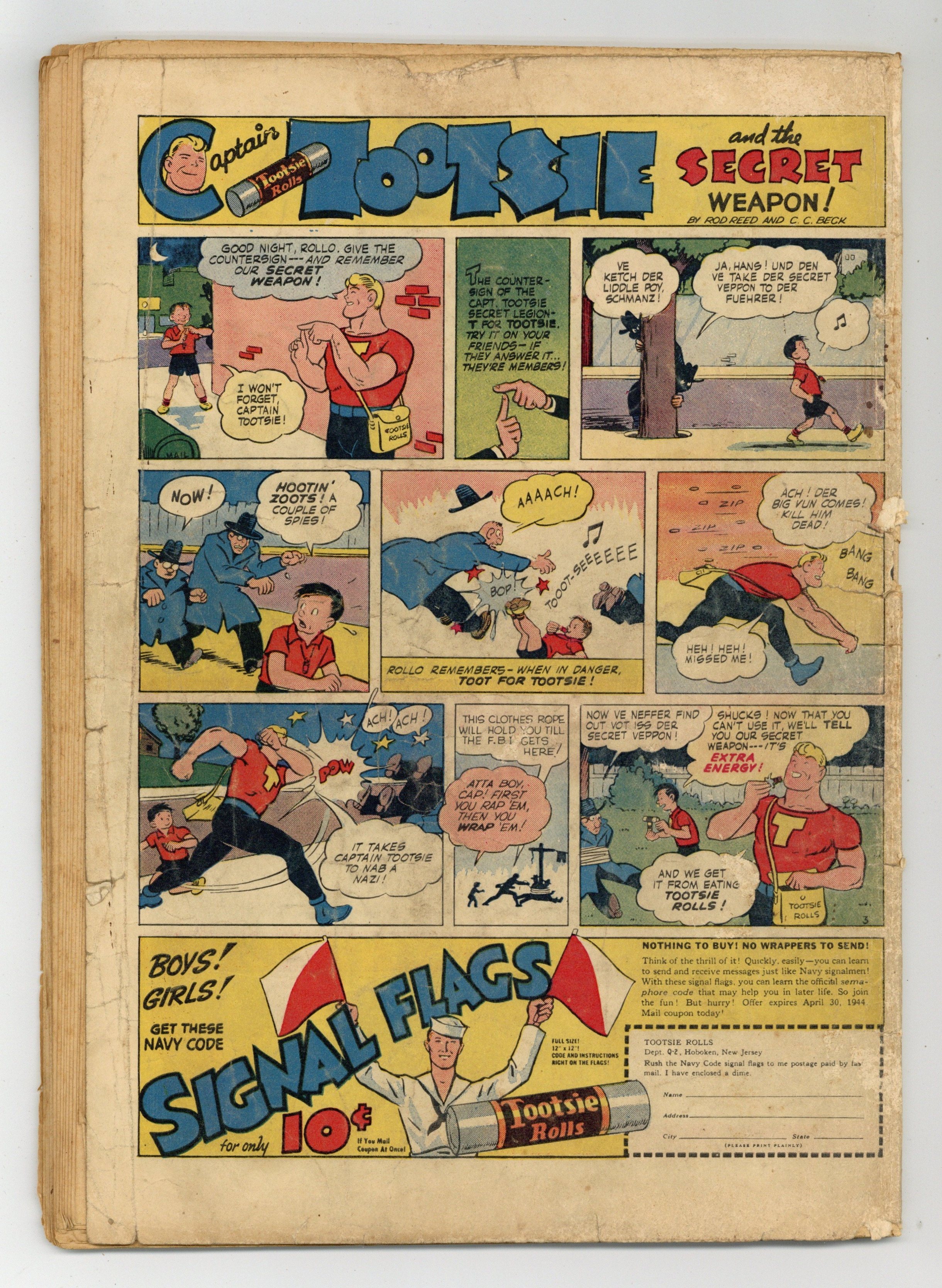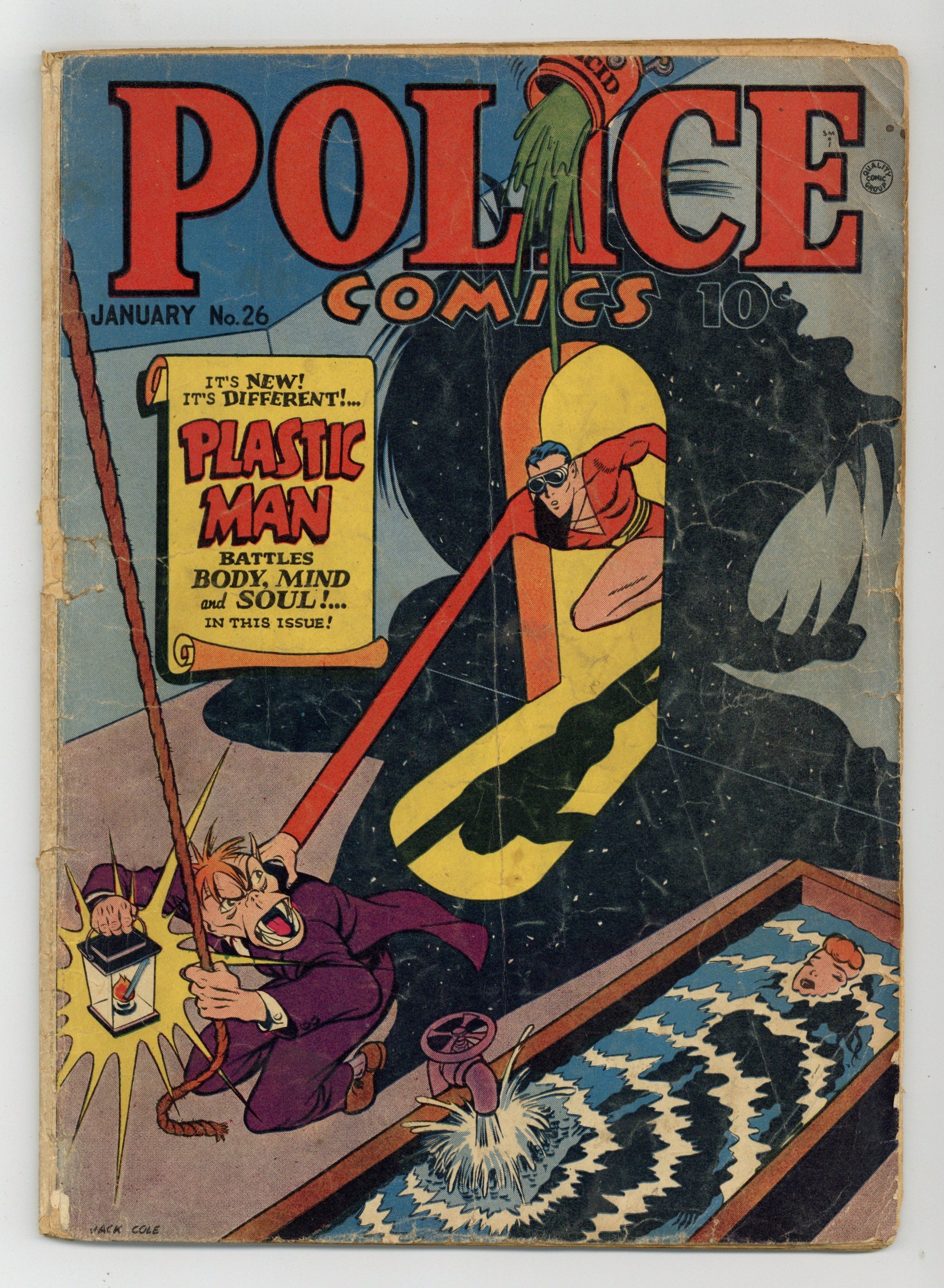 Cover by Jack Cole. "Body, Mind and Soul," script and art by Jack Cole; Chief Branner discovers that Plastic Man is actually a wanted felon, and Plastic Man is ready to submit and do his time; However, the Chief finds him too valuable of asset to the force and gives him an assignment to prove himself by bringing in three wanted crooks. "The Framed Gorilla" starring Flatfoot Burns, art by Harvey Kurtzman. "The Picture Murders" starring Destiny. "The Ghostmaster" starring the Manhunter, art by Al Bryant; A vaudeville performer billed as the Ghostmaster, a great make-up artist, a master of the quick change, and able to bring the dead to life, is bitter when vaudeville died. "Ten Who Never Came Back" text story by Dick Mace. "Patch-Eye the Perilous," art by Mort Leav; The Human Bomb encounters a super-villain named Patch-Eye, an evil genius roboticist. "Fighting the Front" one-page story starring Burp the Twerp, script and art by Jack Cole. "The Death Dolls," script and art by Will Eisner; The Spirit vs. Yagor. 60 pgs., full color. $0.10. Cover price $0.10.