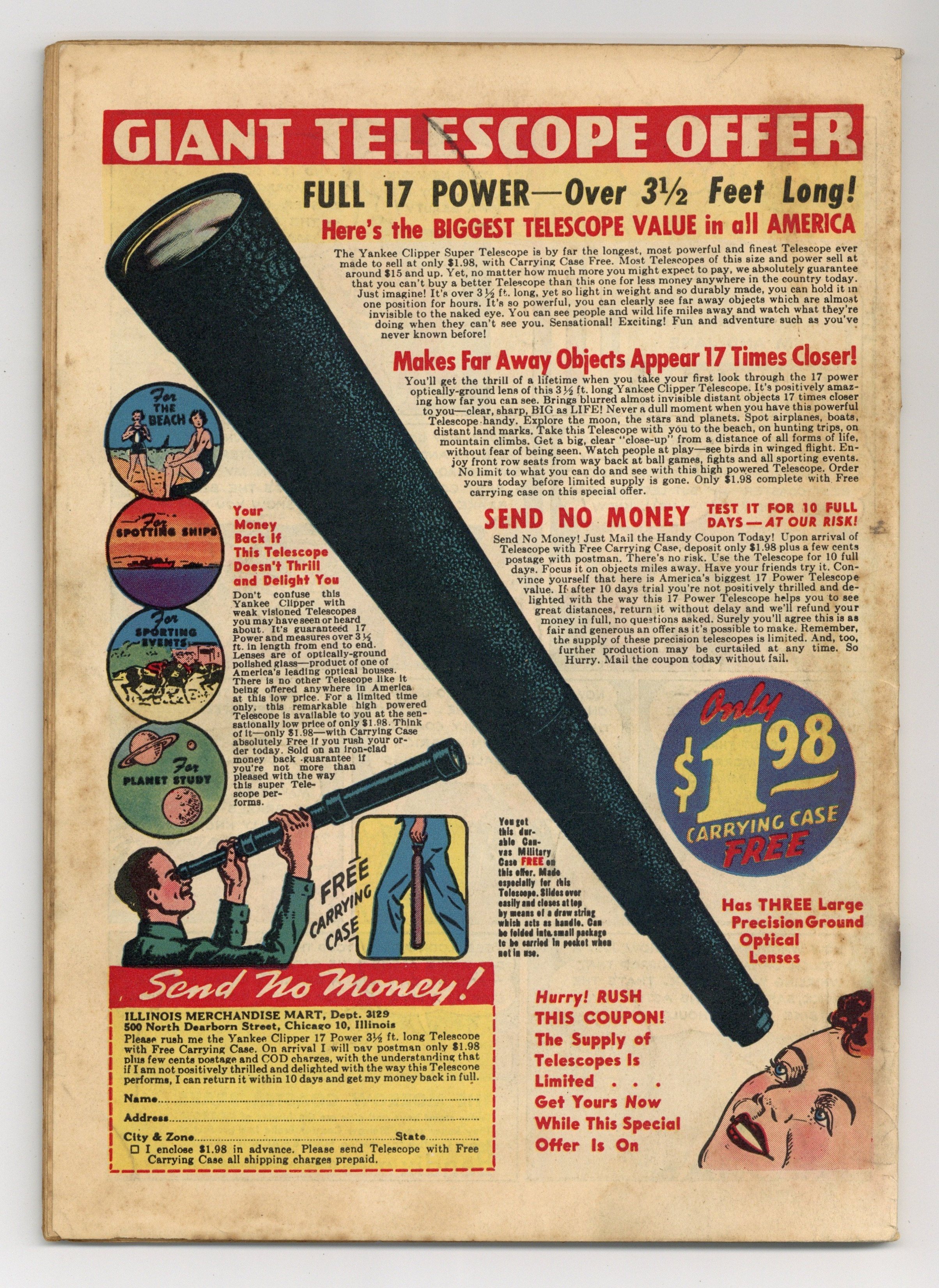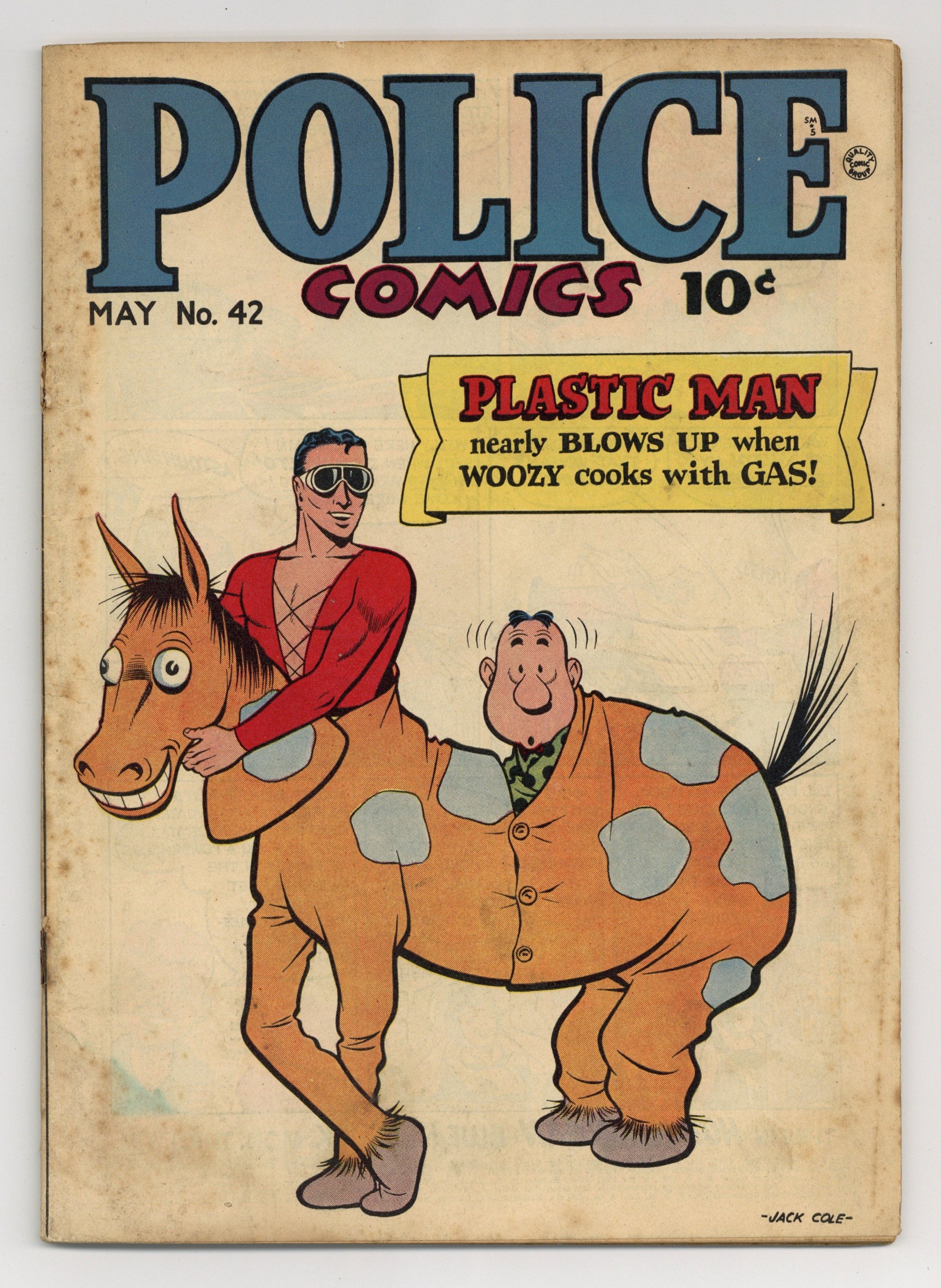 Cover art by Jack Cole. Plastic Man story, script and art by Jack Cole. Candy story, script and art by Harry Sahle. Human Bomb story, script and art by Paul Gustavson. Two Tracks starring Manhunter, art by Al Bryant. Burp the Twerp story, script and art by Jack Cole. Lizzie Dizzie's Hat Shoppe starring Flatfoot Burns, script and pencils by Al Stahl, inks by Janice Valleau (Ginger). Spirit story, script by Will Eisner, art by Will Eisner and Lou Fine. 60 pgs. $0.10. Cover price $0.10.