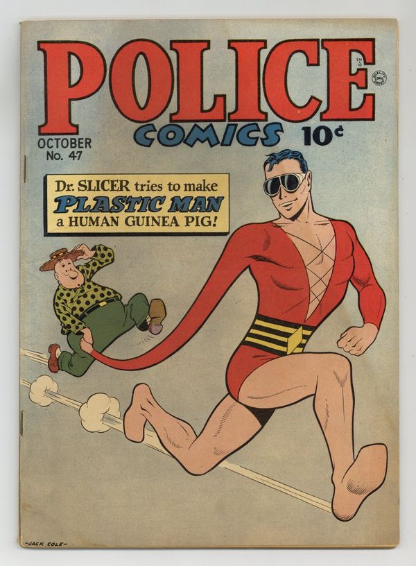 Cover art by Jack Cole. Plastic Man story, script and art by Jack Cole. Flatfoot Burns story, script and art by Al Stahl. Human Bomb story, script and art by Paul Gustavson. Candy story, script and art by Harry Sahle. Burp the Twerp story, script and art by Jack Cole. I'm Guilty! starring Manhunter, art by Al Bryant. Spirit story, pencils by Lou Fine. 60 pgs. $0.10. Cover price $0.10.
