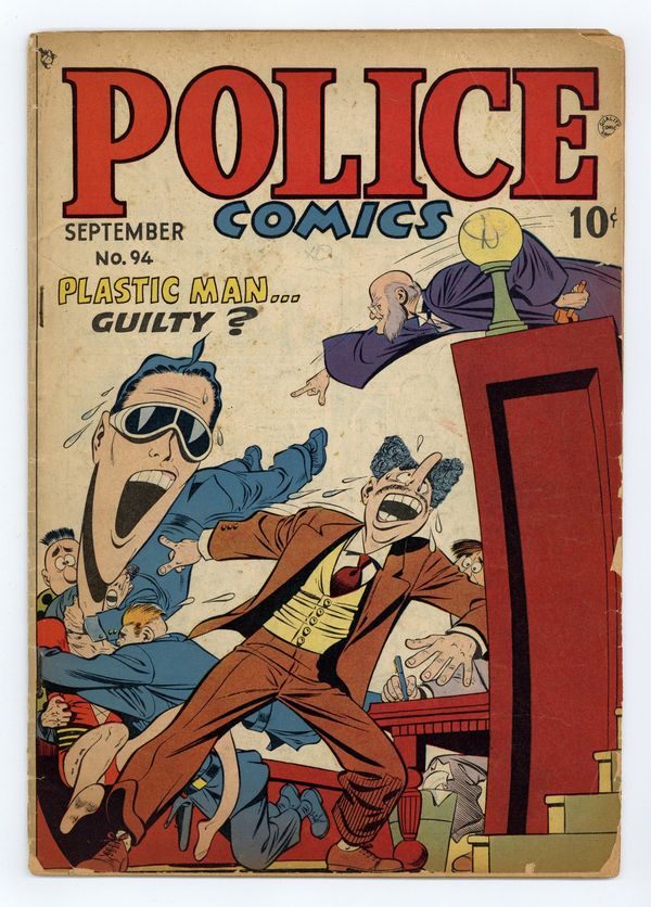 Cover art by Jack Cole. Plastic Man Turns Killer starring Plastic Man, script and art by Jack Cole. Happy Anniversary To Mom and Pop starring Candy, script and art by Harry Sahle. Olga Bustle In "Outcast" starring Spirit, script and art by Will Eisner. Actions Beat Words text story starring Plastic Man. Manhunter story, script and art by Al Bryant. 36 pgs. $.0.10. Cover price $0.10.