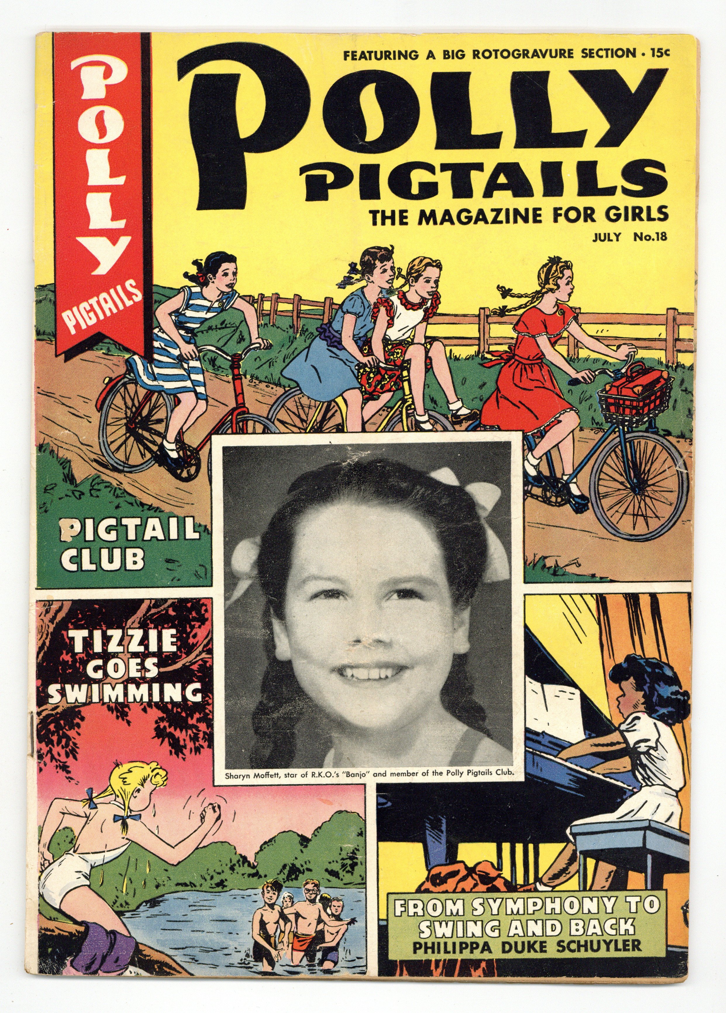 Stories and art by Paula Gregutt, Gordon S. Mosher, Anita Rehbock, Adrien Stoutenburg, Richard Stephen Dodge, Roberta Saffron, Alfred de Martini, Maureen Clawsey, Lois Withers, Nancy Williams, Betty Warren, Laura Leahart, and Marie Cummings. A magazine for girls from the producers of Parents' Magazine, with stories, fashion and advice as well as comics. Child star Sharyn Moffett shares dog-training tips; Tomboy Tizzie goes swimming, but the boys don't want to include her; A comics biography of musical child prodigy Philippa Duke Schuyler. Also featuring a full-color comics ad for "The Margaret O'Brien Candy Kitchen" including images of the young movie star. The Pigtail Club; Linda Learns Her Lesson; You've Got Rhythm; Josie and Her Dream Pony; Tizzie Goes Swimming; Symphony to Swing; Club Problem Page; Here's Looking at You; Hobbies; Training Your Dog; Let's Cook Up a Play; Good Looks, Midsummer Nights Dreamt; Winter's Tale; Through Thick and Thin; Sun Timers; Mirror, Mirror; The Mystery of the Floating Village; Pigtailers Talk Things Over; Polly Prefers; Fun With Fashion; Needle Play; Club News; Polly in the Kitchen. 50 pages, Full Color. Cover price $0.15.