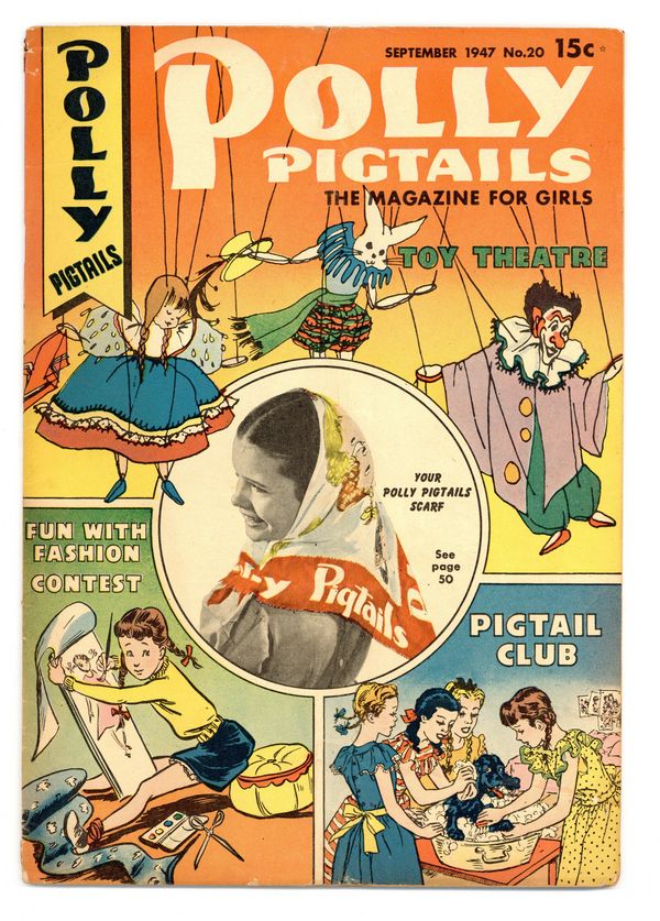 Stories and art by Vic Herman, Cecil Christy, Elizabeth Eicher, Adrien Stoutenburg, Barbara Yager, Lois Withers, Nancy Williams, Anita McGee, and Marie Cummings. A magazine for girls from the producers of Parents' Magazine, with stories, fashion and advice as well as comics. How to make a miniature theatre; Tizzie gets bored shopping with her mother and goes on an adventure; The Pigtail Club's dog Perky gets a chance to be a movie star. The Pigtail Club; That Dog Again!; Curtain Going Up!; A Stitch in Time; Tizzie Goes Shopping; Polly Makes Music; What's Your Score in Eat-iquette?; The Prettiest Girl in the Class; Hobbies; Classroom Classics; All Weather Clothes; The Mystery of the Floating Village; Pigtailers Talk It Over; Polly Prefers; Fun With Fashion; Needle Play; Club News; Polly in the Kitchen. 48 pages, Full Color. Cover price $0.15.