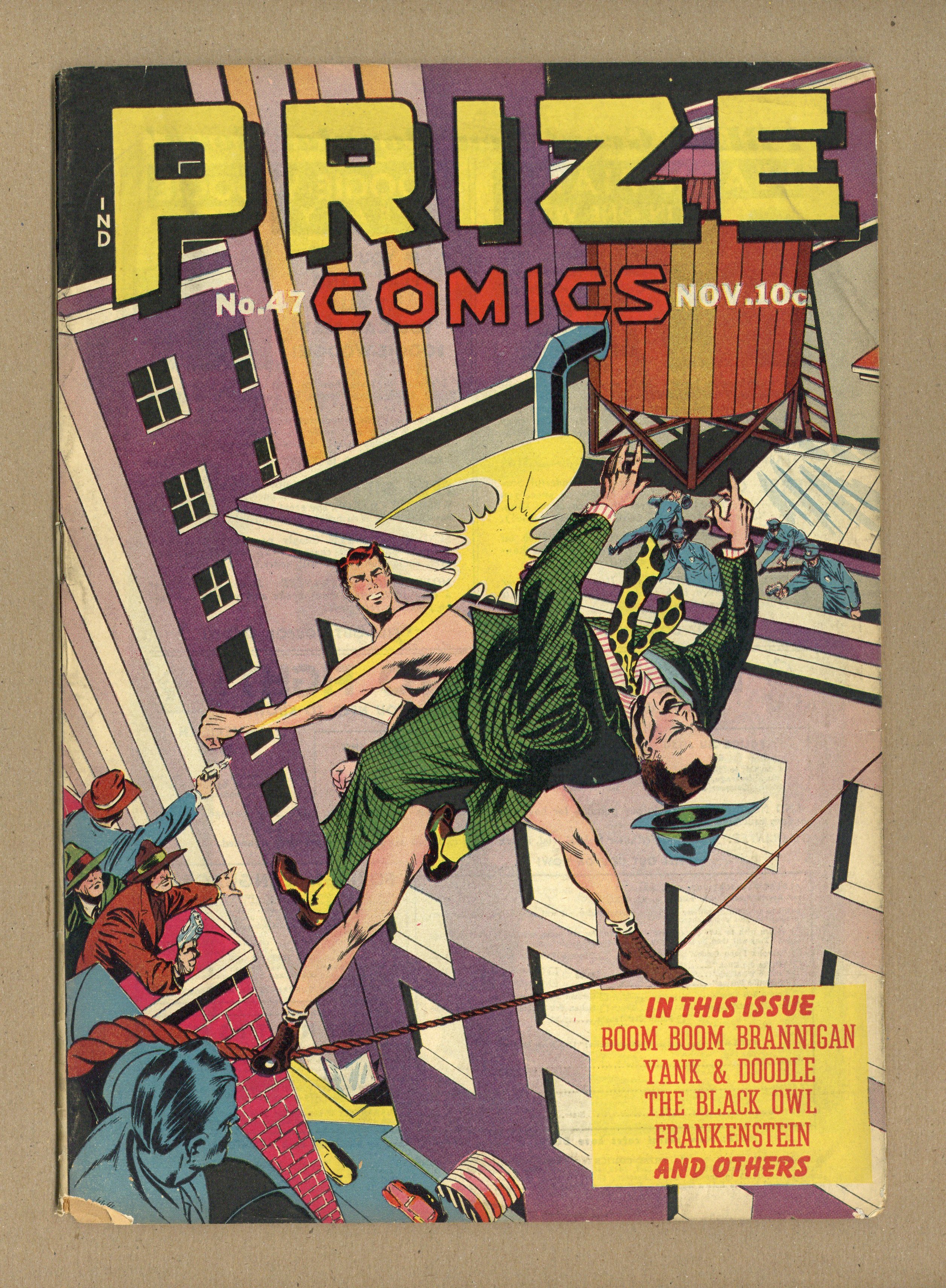 Adventure of the Zombie Bodyguard starring Boom Boom Brannigan, art by Charles Voight. Puzzle of the Persecuted Scientist starring Flying Fist and Bingo, script and art by Fred Morgan. Untitled stories starring Frankenstein (script and art by Dick Briefer), Worldbeater (script by Fred Morgan, art by August Froehlich), and Yank and Doodle and Black Owl. $0.10. Cover price $0.10.