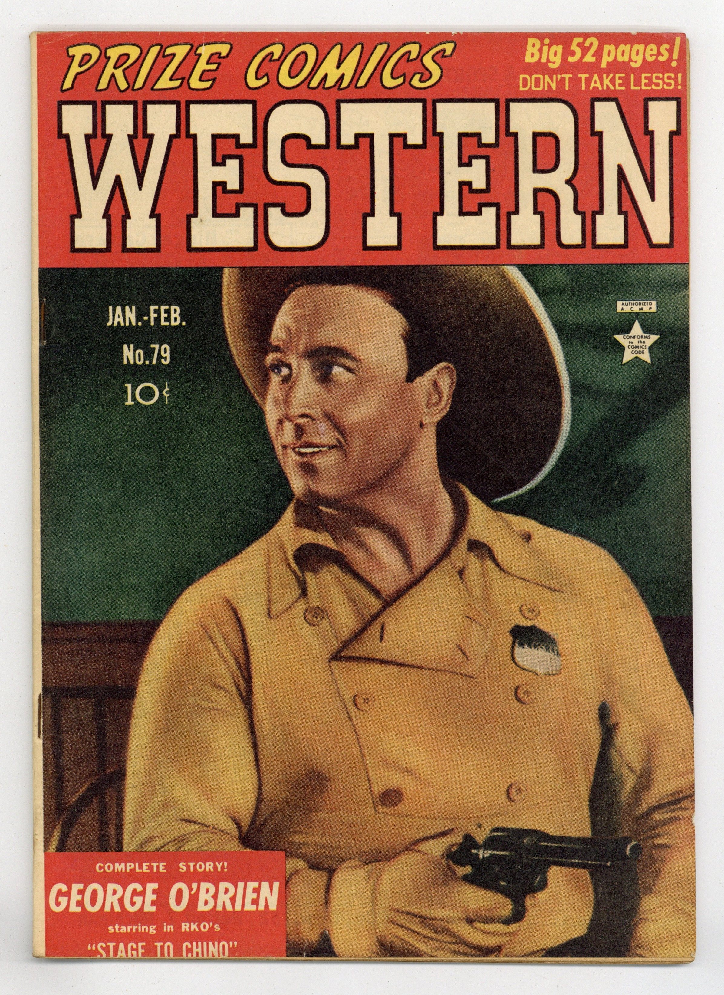 Photo cover features Western star George O'Brien. Art by Mart Bailey, Colin Dawkins, Will Elder and John Severin. Prize's flagship Western title featured early art by John Severin and other greats who worked for EC in the following decade. A comics adaptation of the 1940 RKO Western film "Stage to Chino." A story featuring early art by EC legends John Severin, Will Elder and Harvey Kurtzman. A goat helps The Lazo Kid track gold thieves. Stage to Chino; Treasure of Death Mountain; Lost Trail; Stranger in Benton Bowl; Timberline Showdown. 48 pages, Full Color. Cover price $0.10.