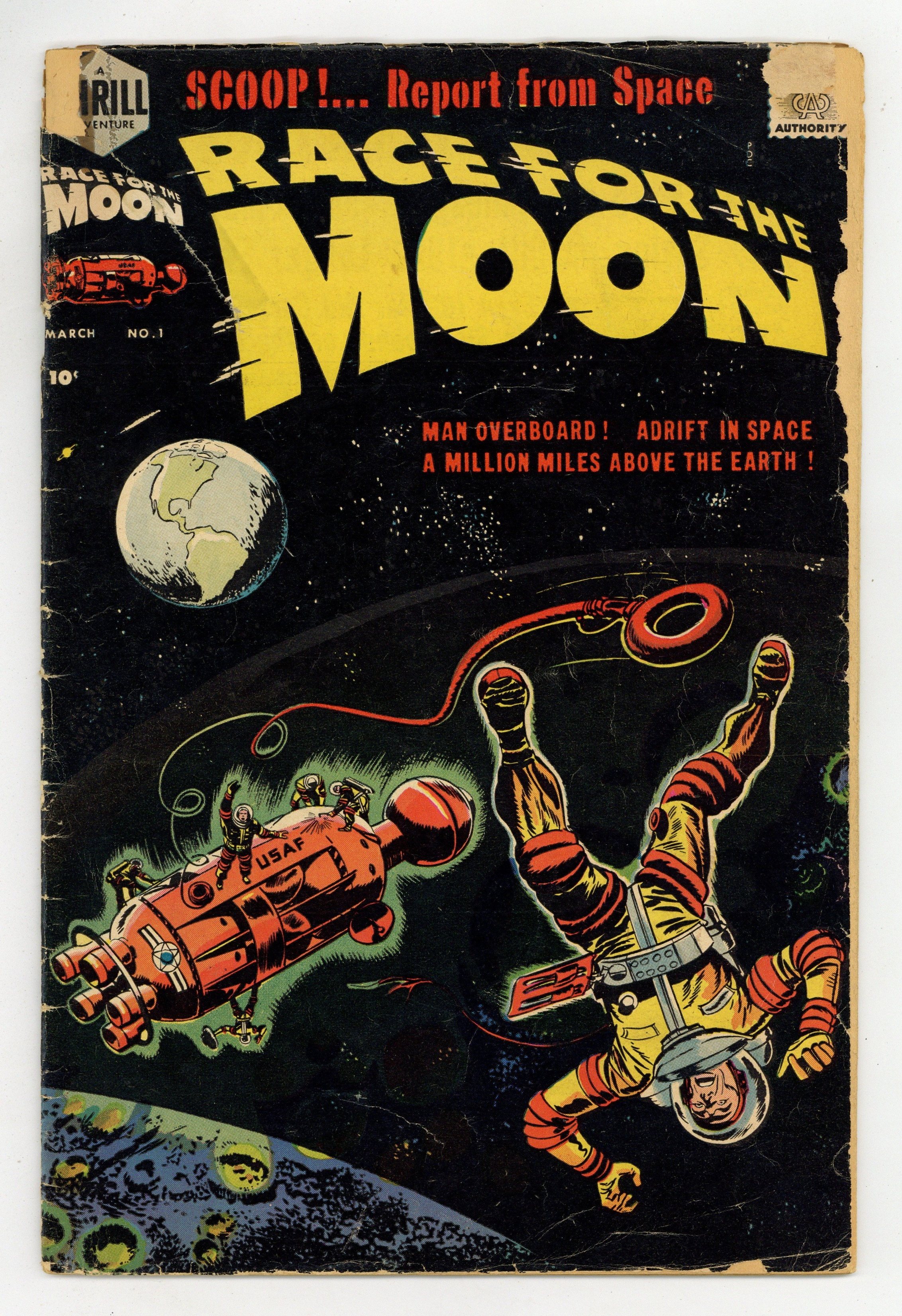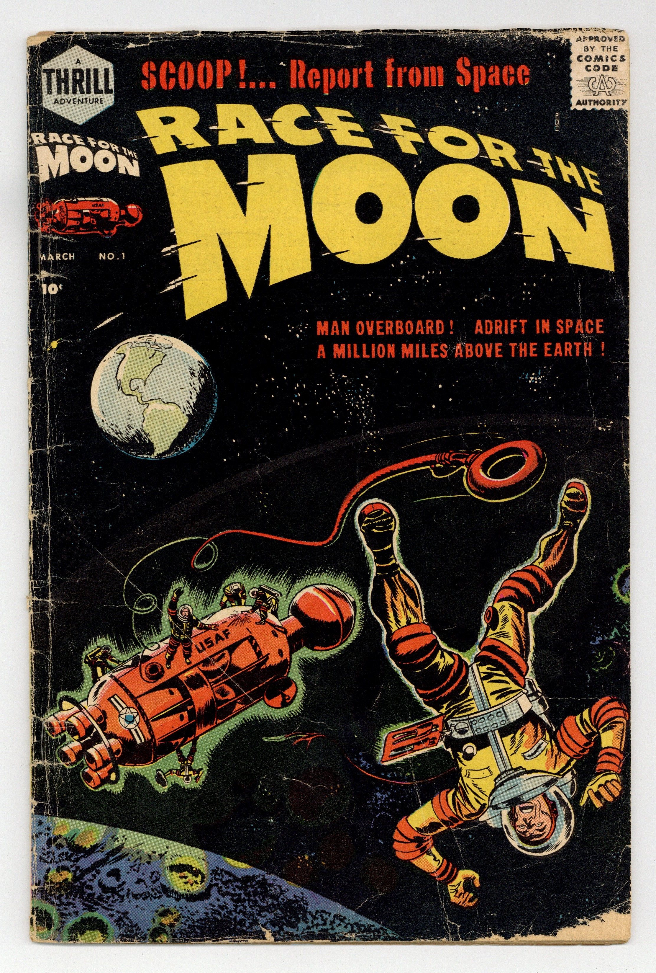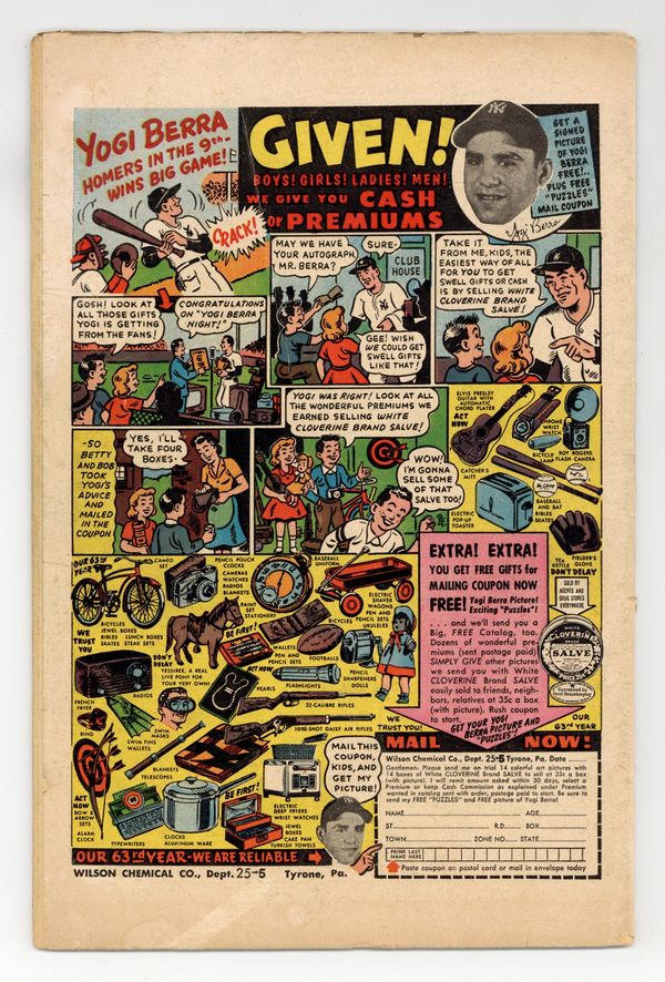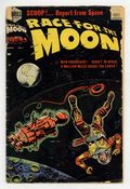 $80.00"Asylum," art by Bob Powell; For thousands of years, an advanced planet had committed horribly insane people to a far-distant planet; But this time a mission is turned back by the now highly-advanced civilization on this distant planet: the planet Earth! "First Man on the Moon," art by Bob Powell. "Supreme Penalty" featuring Chief scientist Frances and Judge Krenk, art by Bob Powell. "Disc Jockey," art by Bob Powell; Sam Webb is a radio station owner and a very unpopular disc jockey who will not take himself off the air; He's so bad that Martians, out of frustration, arrive and forcibly remove him from his post. "So You Want to Go to the Moon" article. "The Invasion," art by Bob Powell; A couple watch a TV news broadcast chronicling an alien invasion and are terrified when Earth's military forces are quickly defeated; Fearing for their lives, they pack and literally run for the hills; They don't hear the news announcer then reveal that the invasion broadcast was an "original tele-screen drama entitled The Invasion From Mars!" Cloverine Salve ad featuring Yogi Berra. 36 pgs., full color. Cover price $0.10.