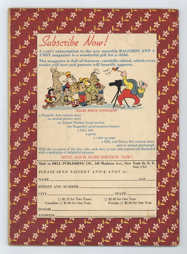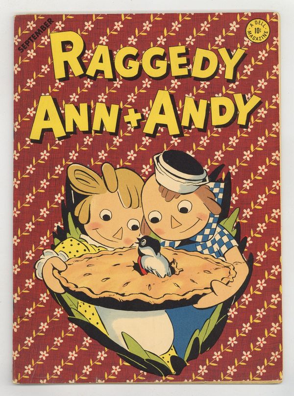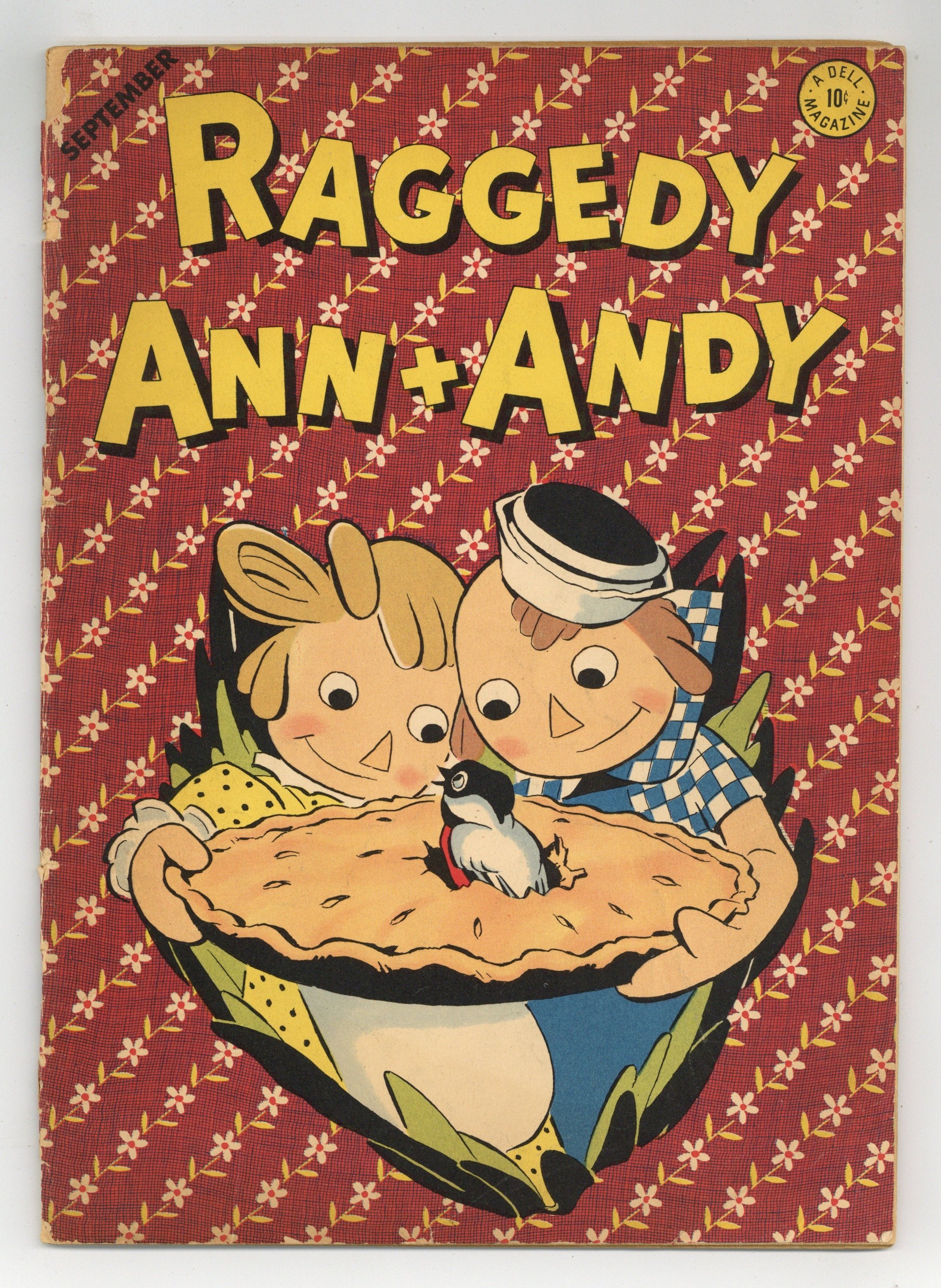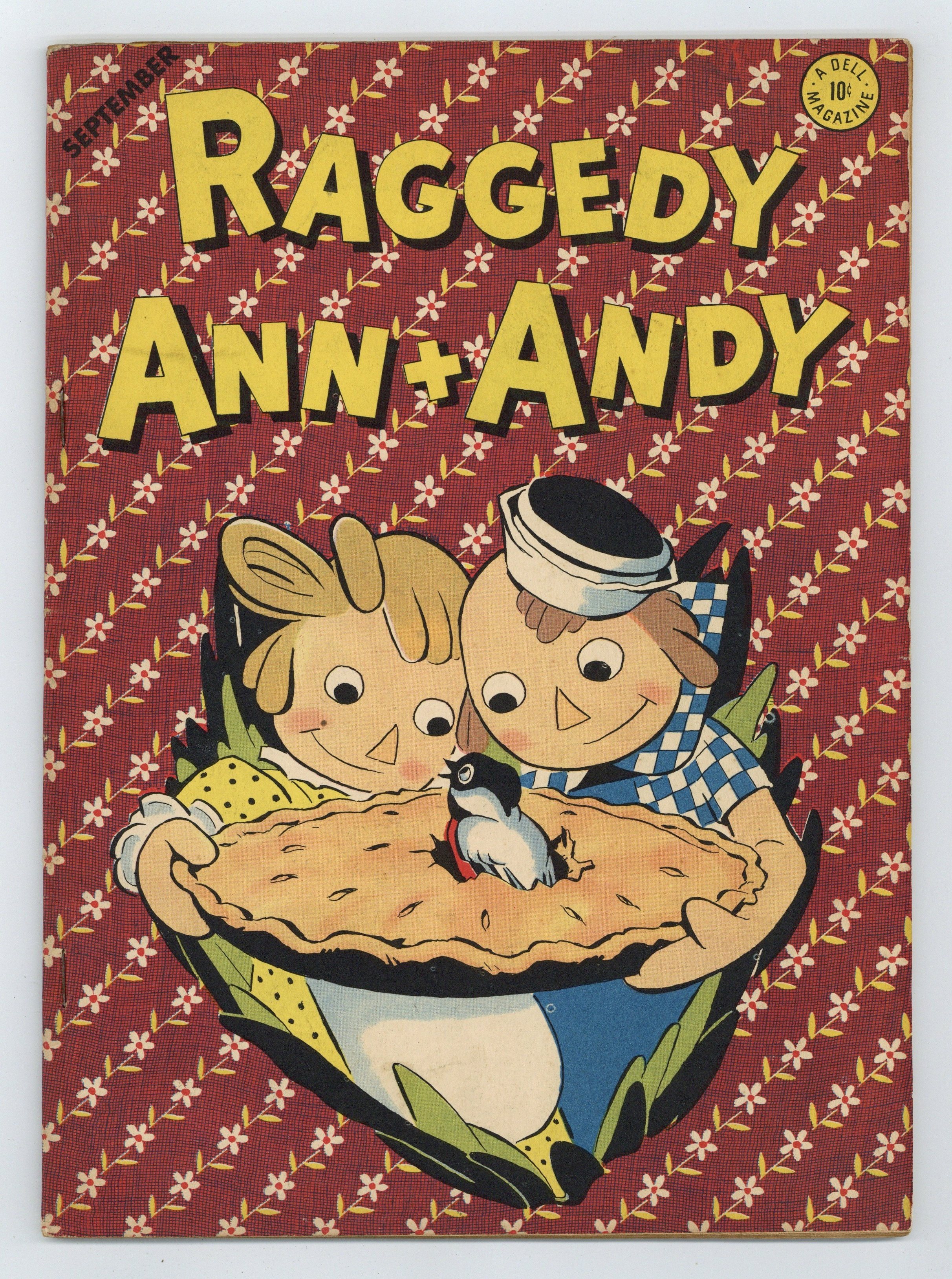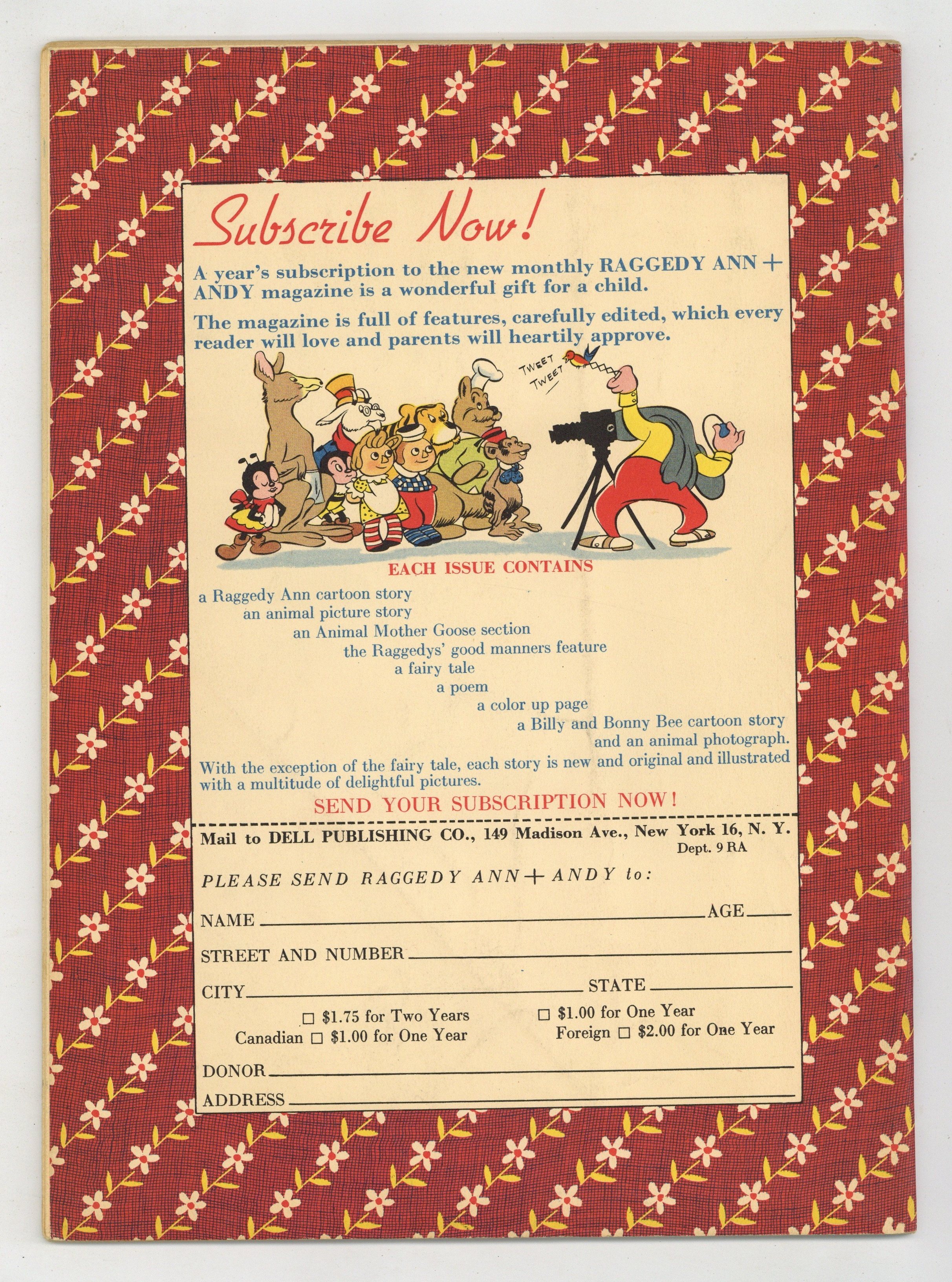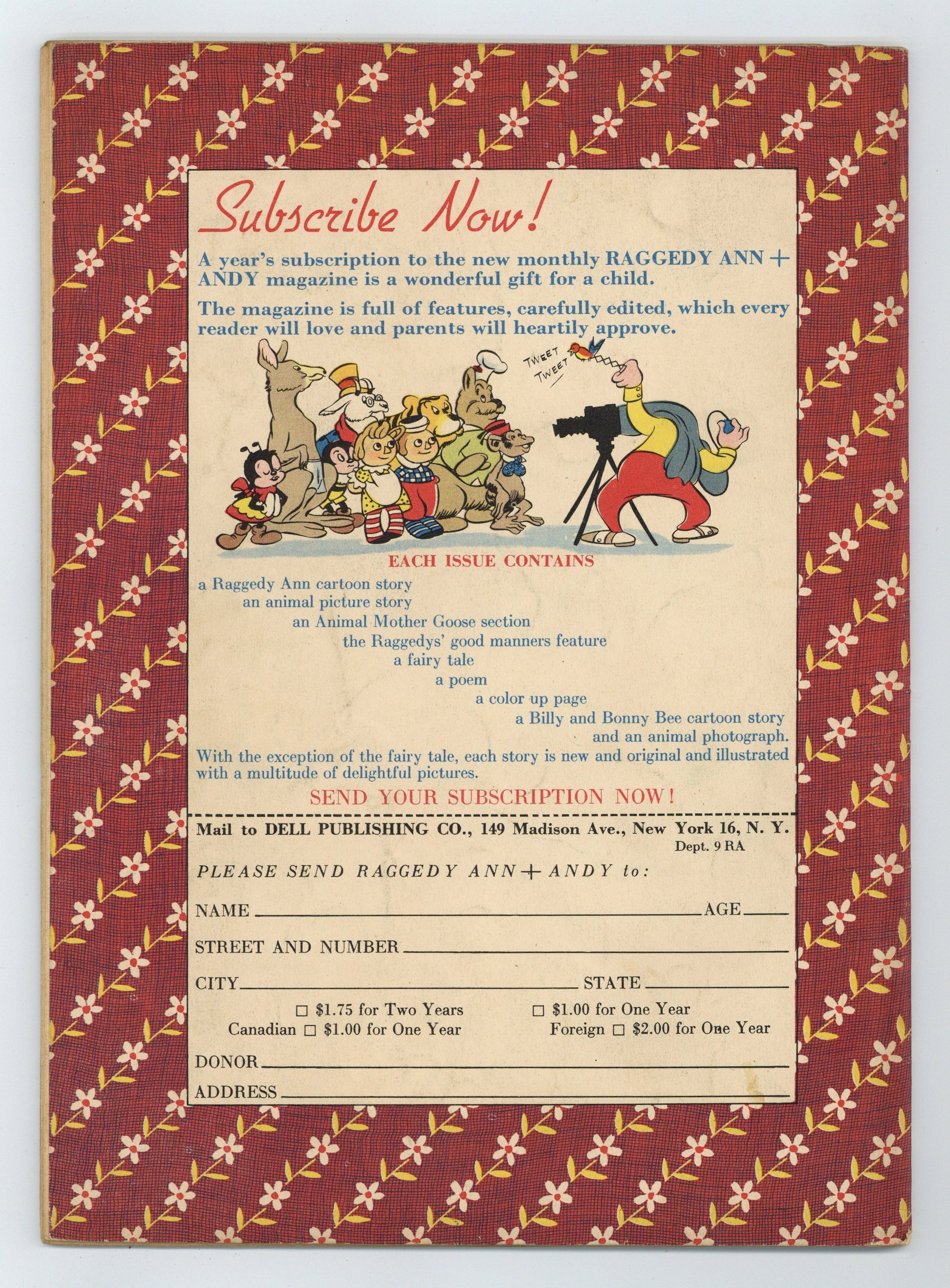 Stories and art by Walt Kelly, Morris Gollub, George Kerr (credited as Johnny Gruelle), Oskar Lebeck, W.J. Enright, H. Armstrong Roberts and Dan Noonan. Johnny Gruelle's famous doll characters have adventures and learn lessons, featuring early art from Walt Kelly. Legendary Pogo artist Walt Kelly adapts Mother Goose nursery rhymes, including Baa, Baa, Black Sheep, Simple Simon, and Hickory, Dickory, Dock. Kelly also provides the art for another classic children's tale, Master Mouse and the Frog. Plus activity pages and "nonesuch" animals. Raggedy Ann; Master Mouse and the Frog; The Raggedy Way; The Giants Three Golden Hairs; Fred, the Dachshund; Billy and Bonny Bee; Two Baby Pandas. 48 pages, Full Color. Cover price $0.10.