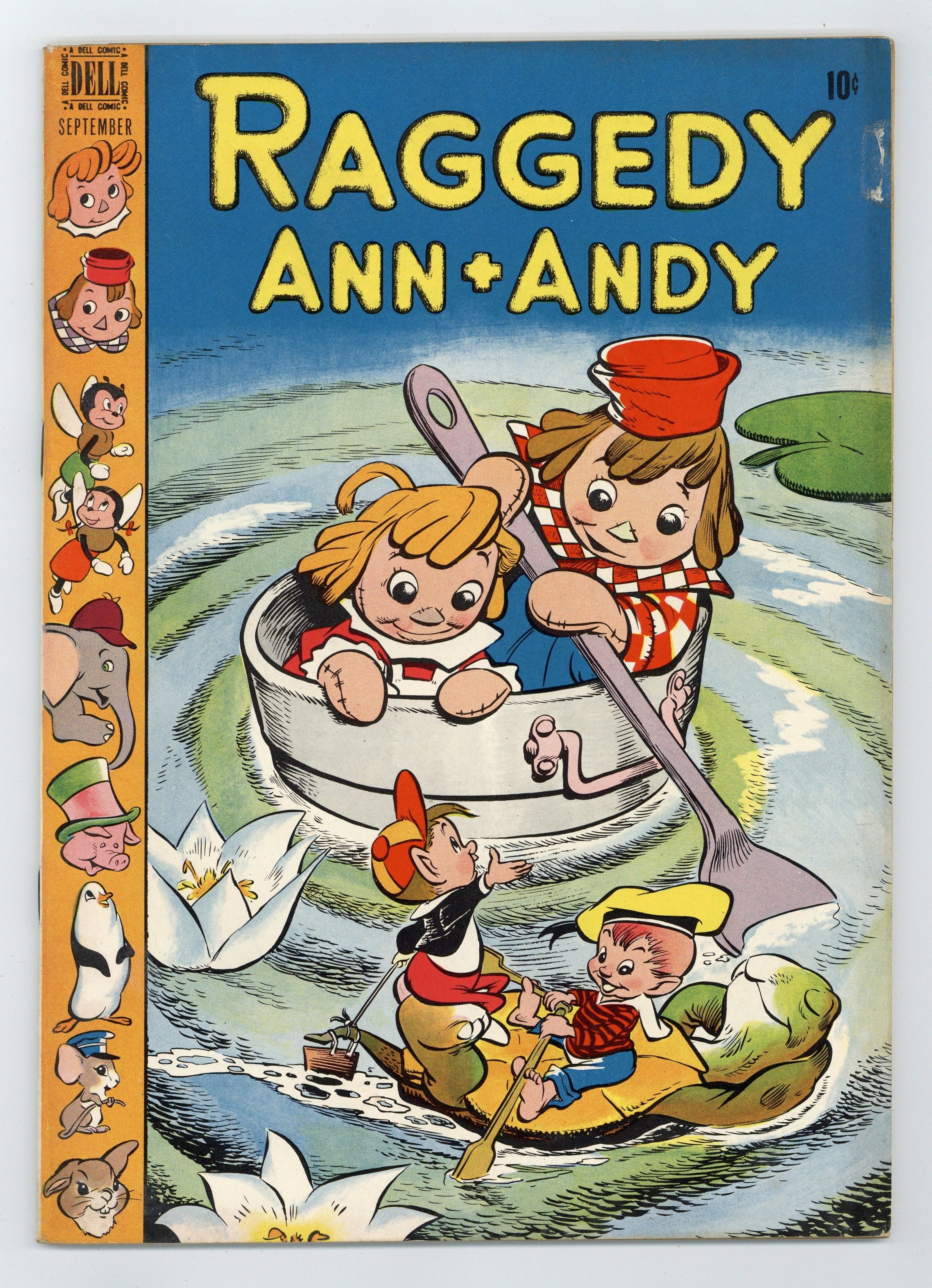 Cover by Walt Kelly. Stories and art by Walt Kelly, Morris Gollub, Mary Greenwalt, Elizabeth Coatsworth, Frank Jupo and Dan Noonan. Johnny Gruelle's famous doll characters have adventures and learn lessons, featuring early art from Walt Kelly. Legendary Pogo artist Walt Kelly adapts Mother Goose nursery rhymes, including Mary Had a Little Lamb and The Train That Goes Choo! Kelly also contributes the cover for the first time, as well as a 12-page story featuring two Brownies, Windy and Button. Raggedy Ann and Andy must elude a giant and his wife to find a magic hen that lays golden eggs. Plus activity pages and "nonesuch" animals. Animal Mother Goose; The Brownies; Raggedy Ann; None-Such Animals: The Prux; Egbert Elephant; The Raggedy Way; Ken and Nate; The Cinderella of Insect Land; A Bunch of Blue Ribbon; Billy and Bonny Bee. 48 pages, Full Color. Cover price $0.10.