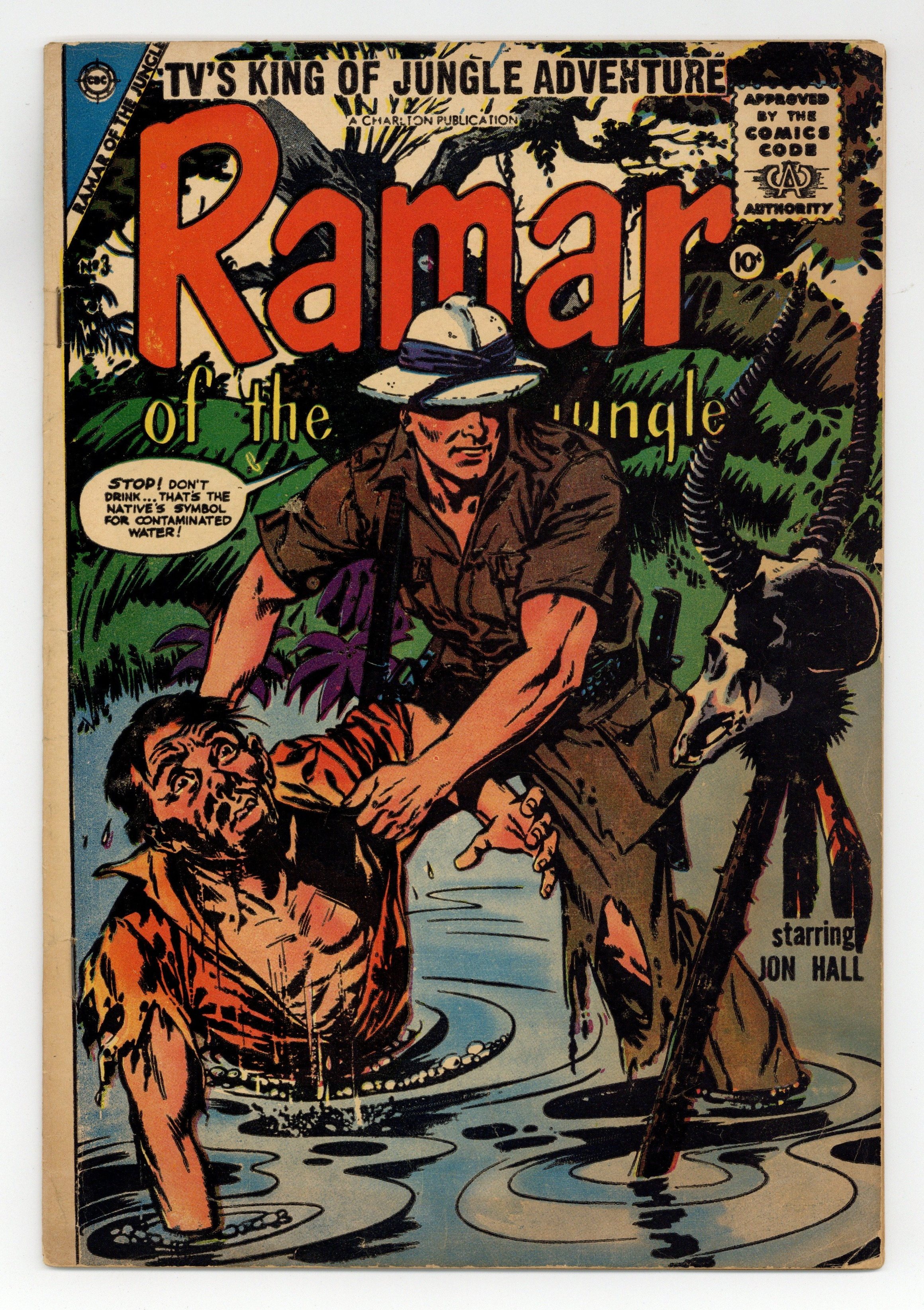 Published Jan 1955 by Toby Press.$16.75Stories and art by Charles Nicholas, Jon D'Agostino, Bill Molno, Marc Swayze and Howard Boughner. Jungle adventure based on a TV series, as white doctor Tom Reynolds sets up shop in Africa and earns the name "Ramar." Ramar tracks poachers into the deadly Green Doom, towering stands of razor-grass that no man has ever crossed through unscathed. Voodoo dolls perplex Ramar, a man of science, but they seem to work on those who believe. Deep-sea divers discover a sunken treasure ship and dare to retrieve its fortunes. Trader Tom; The Tyranny of Hama; The Witch Doctor's Dolls; Egbert the Explorer; Prisoner in Charge; Green Doom; Deep Treasure; Ballyhoo Barney: Which Twin Is the Phony; Quiz. 32 pages, Full Color. Cover price $0.10.