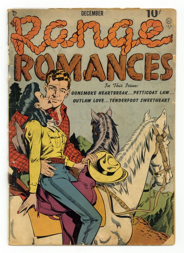Cover by Paul Gustavson and Bill Ward. Stories by Joe Millard and unknown. Art by Paul Gustavson, Bill Ward and unknown. "Gunsmoke Heartbreak" with art by Paul Gustavson and Bill Ward; characters in this story: Del Stuart [Della Stuart]; Race Whitley; Bat Haley; Robert Stuart; Clint Derwin; Buck; Slim. Plus: "Petticoat Law" with story by Joe Millard; characters in this story: Katie Ryan; Sheriff Matt Westerly; Jed Wilkins; Duke Kellan (villain). Also: "Outlaw Love" with story by Joe Millard; characters in this story: Sue Wade; Marshal Clay Dallas; Bonny (a horse); Shorty; The Gifford Gang [Hack (villain); Mr. Gifford (villain); Pete (villain)]. And: "Tenderfoot Sweetheart" with story by Joe Millard; characters in this story: Fran Barlowe; Tenderfoot [Ron Boyce]; Tom Barlowe; Dade Ross; Old Belle (a horse). Also in this issue: 1-page text story "Riding for a Fall"; characters in this text story: Jennie Keenan; Jed Munro; Devil (a horse). 32 pages, full color. Cover price $0.10.