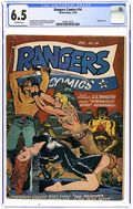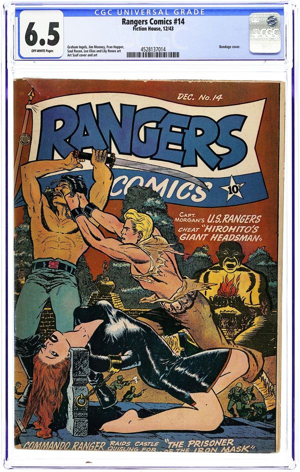 Cover by Art Saaf. Edited by Jean M. Press. Stories and art by Art Saaf, Graham Ingels, Saul Rosen, Fran Hopper, Lily Renee, and Lee Elias. Tales of adventure from pioneering comics publisher Fiction House. Commando Ranger switches to a more traditional military uniform as he faces Norsa, queen of the underground; Glory Forbes gets a job at a train station and stumbles on the kidnapping of a government agent; The Werewolf Hunter faces a gypsy sorceress and her creepily lifelike puppets after Ann is abducted. Bondage cover by Art Saaf. U.S. Rangers; Commando Ranger; The Werewolf Hunter; The Sea Devil; The Silver Ape of Lilani; Glory Forbes; Private Elmer Pippin and the Colonel's Daughter; The Phantom Falcons. 60 pages, Full Color. Cover price $0.10.