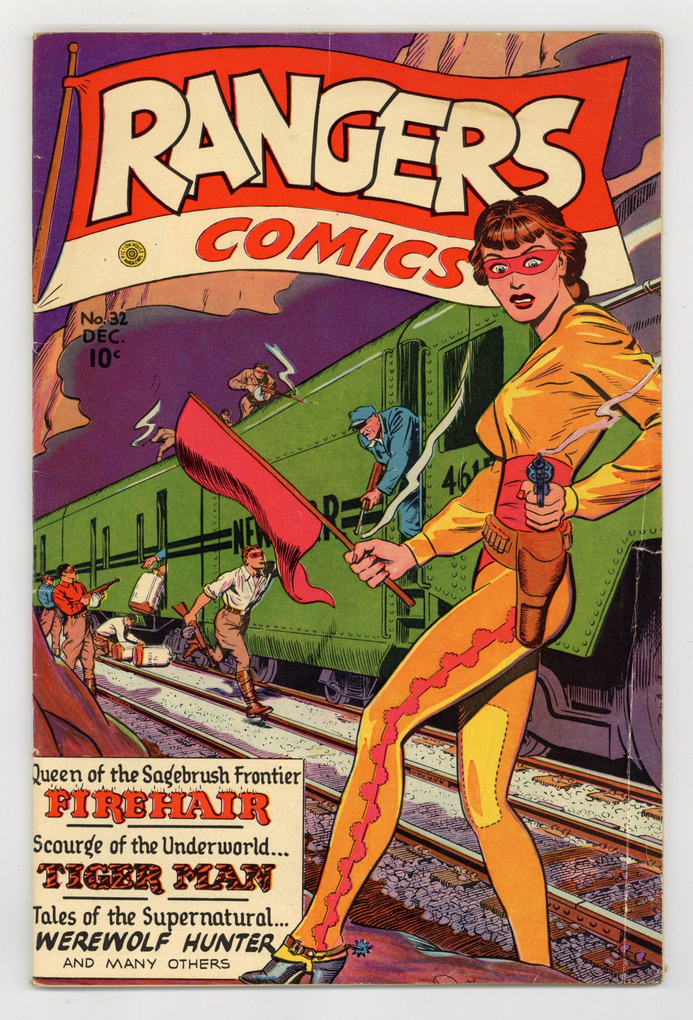 Cover by Joe Doolin. Edited by Jack Byrne. Stories and art by Bob Lubbers, Charles Sultan, John Celardo, Lily Renee, and Howard Larsen. Tales of adventure from pioneering comics publisher Fiction House. The castaways of Crusoe Island hope for rescue, while their mad captive plans his escape; The Werewolf Hunter and a mad scientist are beamed into a micro-world of advanced technology; Good-girl art galore as Glory Forbes winds up in a tiger cage while investigating crooks at a circus. Another offbeat action-girl cover by Joe Doolin. Firehair; Ben Blueridge; Glory Forbes; Sky Rangers; Crusoe Island; Homeless Homer; Mine-All Mine; The Werewolf Hunter; Tiger Man. 52 pages, Full Color. Cover price $0.10.