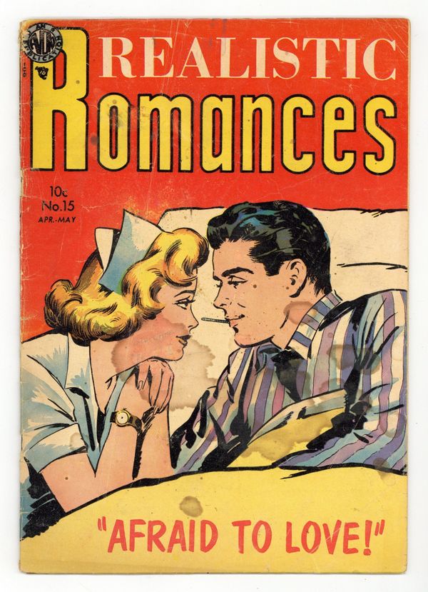 Art by Harold Larsen, Gene Fawcette, Manny Stallman, Myron Fass and Louis Ravielli. Tales of romance with lush, lurid covers reprinted from Avon paperbacks. This issue reprints Romantic Love (1949) #5 in its entirety. Margo falls for a baseball player after shes waylaid by a foul ball; Susan tries to win wealthy Dexter by pushing his girlfriend out a window; A supposed sorority initiation turns out to be a plot to separate Audrey from her boyfriend; Supposedly innocent Andrea is secretly plotting to steal her roommate Ritas boyfriend Al, but hes not having it. Afraid to Love!; With Evil in Your Heart; Love Me Always Darling!; Two-Gun Lady; Innocence Was My Angle! 32 pages, Full Color. Cover price $0.10.