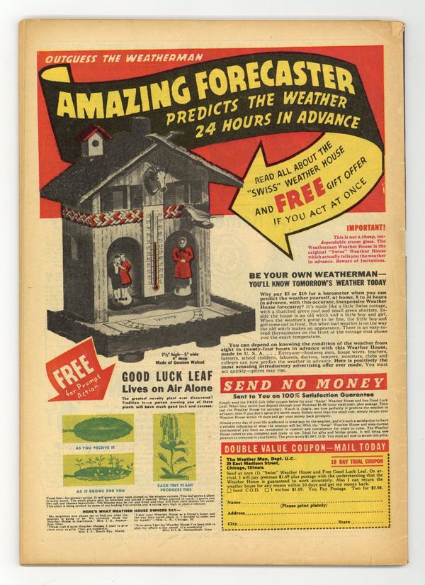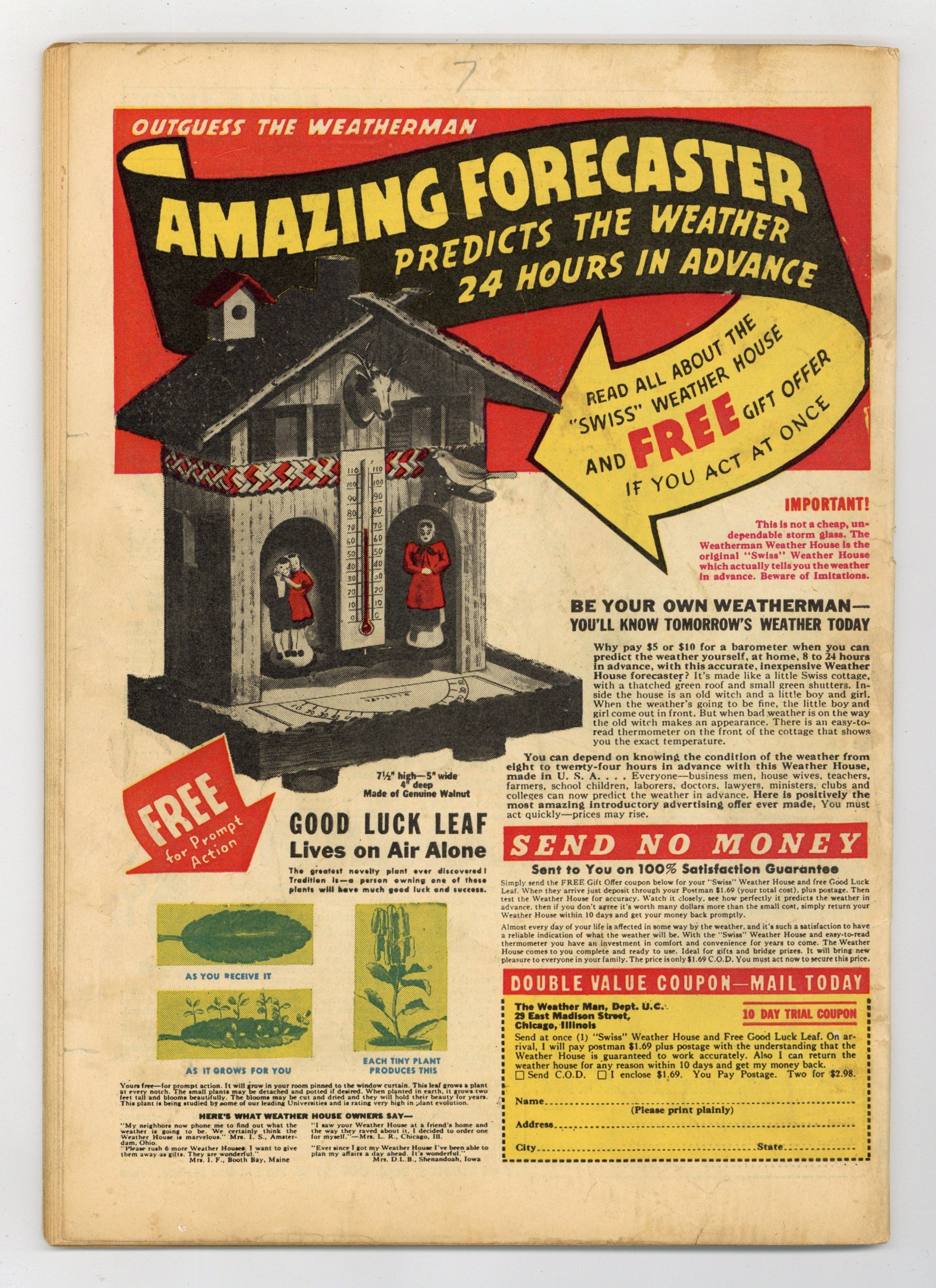 Cover by Leonard Starr. Stories and art by Leonard Starr and Frank Bolle. Adventure comics from Rural Home Publishing. Teen detective Dinky Dibbs and his parrot sidekick set out to prove that a parrot can be as useful as a dog when it comes to fighting crime and saving lives. When vaudeville comedian Mike is doing a crank-call bit, he hears a woman in trouble at the other end of the line, and investigates as The Prankster. Solve-a-Crime dares the reader to figure out the clues and discover who pushed a man in front of a subway car. Secret Assignment; Solve-a-Crime; Saunders of State; Pathfinder; Dinky Dibbs; The Prankster: Adventure of the Sudden Scream; El Kuraan; Red Riot; Name the Place in Each State. 52 pages, Full Color. Cover price $0.10.