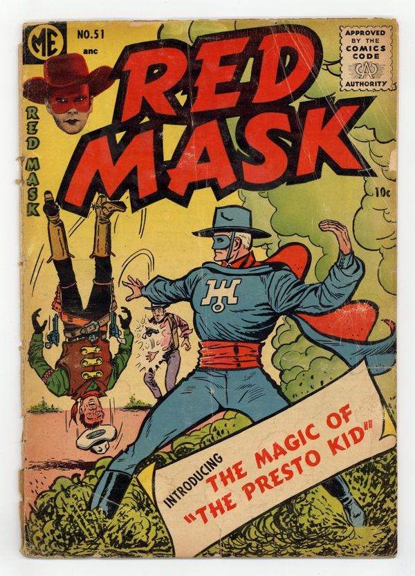 Stories by Carl Memling and Gardner Fox. Art by Frank Bolle, Ernie Bache and Dick Ayers. Cover by Dick Ayers. Western adventure starring movie cowboy Tim Holt. Redmask agrees to escort a gold shipment along a mountain trail plagued by outlaw attacks. The Ghost Rider is replaced by the more Comics Code-friendly Presto Kid, who uses stage magic instead of guns. A retired detective helps Redmask track a robber who always leaves behind purple gloves. Path of Peril; The Purple Glove Gang; The Frozen Gold; Enter: The Presto Kid! 32 pages, Full Color. Cover price $0.10.
