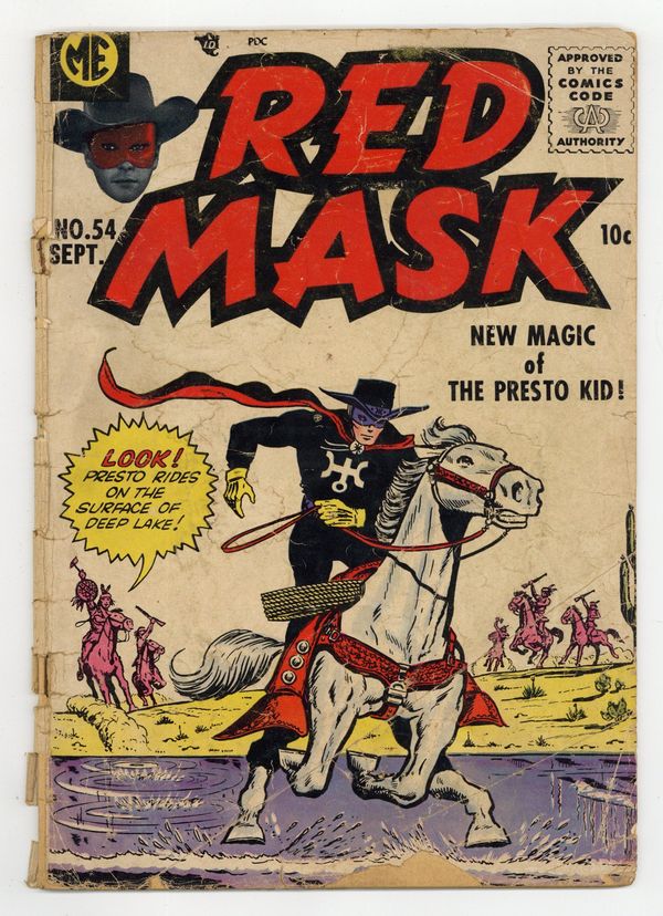 Stories by Carl Memling and others. Art by Frank Bolle, Fred Guardineer and Dick Ayers. Cover by Dick Ayers. Western adventure starring movie cowboy Tim Holt. When the town sheriff takes a vacation, his inept cousin steps in. The Presto Kid uses magic to prevent an outlaw from starting a war with the native tribes. Redmask and Black Phantom try to find out why outlaws are targeting a penniless farmer. The Luck of Major Hanley; The Substitute Sheriff; The Presto Kid: The Floating Renegade!; Western Dictionary; The Unknown Treasure! Final issue of the series. 32 pages, Full Color. Cover price $0.10.