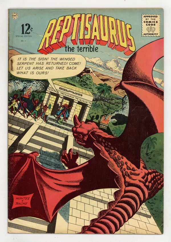 Cover by Bill Montes and Ernie Bache. Stories and art by Bill Montes, Ernie Bache, and Joe Gill. The third of Charlton's trifecta of monster comics based on 1961 monster B-movies, after Konga and Gorgo. Reptisaurus and his mate find a refuge in the deep jungles of South America. But that is also where a lost tribe of Aztecs survives, and they see Mr. and Mrs. Reptisaurus as a signal that they should rise up and take the world back from the invading forces. A backup story traces the sea creatures who first crawled up onto land. Idol of the Aztecs; Uhazmal; The Beginning. Final adventure of the creature who began as "Reptilicus." 32 pages, Full Color. Cover price $0.12.