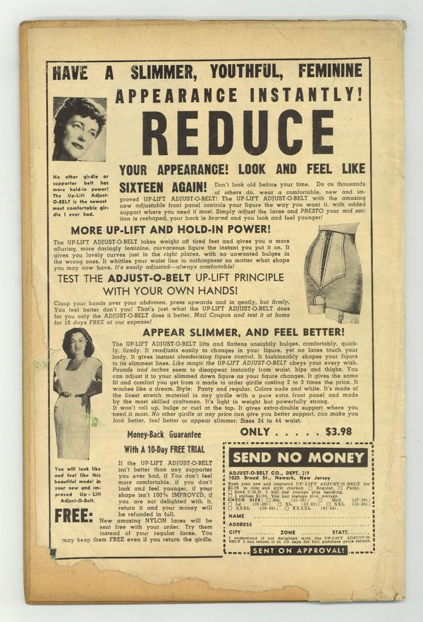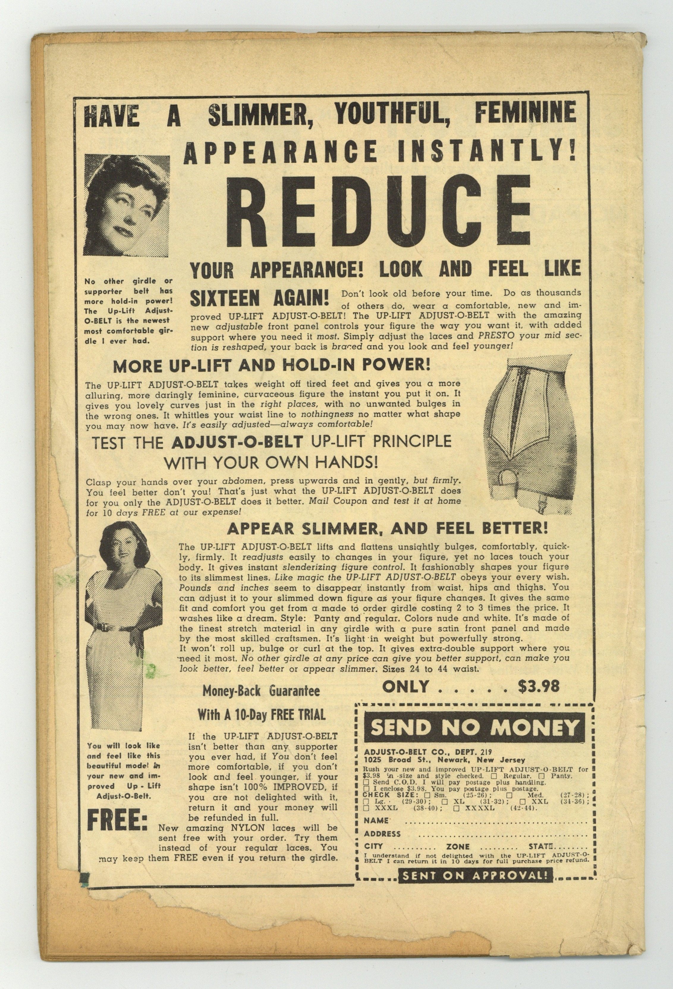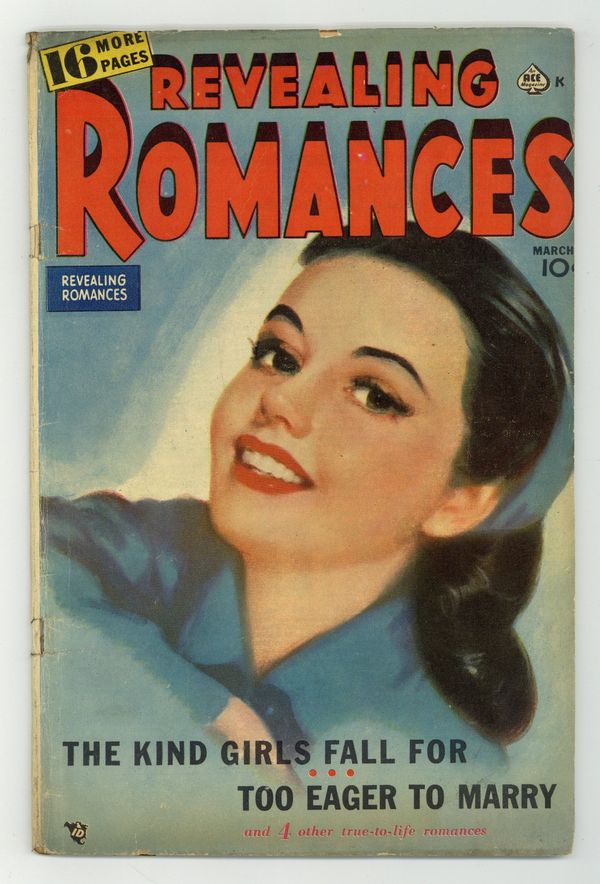 $160.00Painted cover art. "The Kind Girls Fall For," art by Al Hartley; Janette took over her father's restaurant when he died; With the help of Charlie, she makes it a success; Janette hires Lee as a counterman but Charlie dislikes him because he's popular with the female employees. "Her Sinister Scheme," art by Ed Waldman; Karen agrees to marry her boss Don, but Don's younger sister Lynn tells Karen that Don had a previous girlfriend, Gladys; Karen becomes jealous until Don explains that Gladys is the sister of his hospitalised "war buddy." "Too Eager to Marry"; Fran is desperate to get married so she can move away from her lower-class family; She arranges to elope with Rick, but her brother's friend Van, a police detective, exposes Rick's scheme: the wedding would have been fake. "Crooner's Sweetheart," art by Ann Brewster; Betty helps her fiancé Kerry's singing career, rescuing him when he suffers from stage fright; Talent agent Earl signs Kerry to a contract and takes him to the big city; When Betty shows up for a visit, she sees Kerry has to drink to overcome his nerves. "Heartbreak Proposal," art by Lin Streeter; Sheila is lawyer Corey's secretary, but when her brother Dix embezzles money from his employer Bart, Bart threatens to have him jailed unless Sheila comes to work for him for 3 months and becomes his fiance. "Love Was His Game," art by Alice Kirkpatrick; Elise has a good job in the city but is lonely; She's attracted to her neighbor Martin, but they don't really know each other; Elise's co-worker Sara invites her for a weekend in the country, and Elise meets Sara's cousin Bob. "The Kind Girls Fall For" reprinted in Real Love (1949-56 Ace) #64; "Her Sinister Scheme"; "Too Eager to Marry" reprinted in Love Experiences (1949) #28 and Complete Love Magazine Vol. 31 (1955) #6; "Crooner's Sweetheart" reprinted in Love Experiences (1949) #38a; "Heartbreak Proposal" reprinted in Complete Love Magazine Vol. 30 (1954) #5; and "Love Was His Game" art by Alice Kirkpatrick. "For Beauty's Sake: Alluring Lips..." text article partially reprinted in "Glamorizing Yourself..." in Glamorous Romances (1949) #54, "For Beauty's Sake..." in Ten Story Love Vol. 30 (1952) #1, "Glamorizing Yourself..." in Glamorous Romances (1949) #64, "The Most of Your Charms..." in Ten Story Love Vol. 33 (1954) #1, and "Bring Out Your Best..." in Ten Story Love Vol. 36 (1955) #2. "After the Beauty Contest" and "In an Indian Pueblo" text stories. 52 pages. Full color. Cover price $0.10.