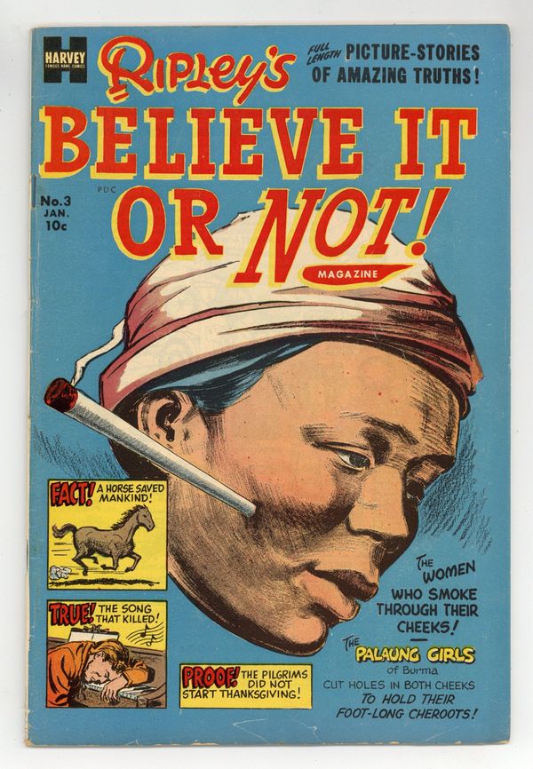 Stories and art by Robert Ripley and others. Harvey presents the first comic-book based on the popular comic strip featuring oddball facts from around the world. The strange smoking habits of the Palaung women. The unknown true story behind the first Thanksgiving. How horses saved the human race. The Song That Brought Disaster; The Turkey That Caused a Gold Rush; The Name's the Same; A Horse Saved Mankind; Believe It Or Not!; The Story Behind Thanksgiving; The Ghost That Was Worth 120 Million Dollars. 36 pages, full color. Cover price $0.10.