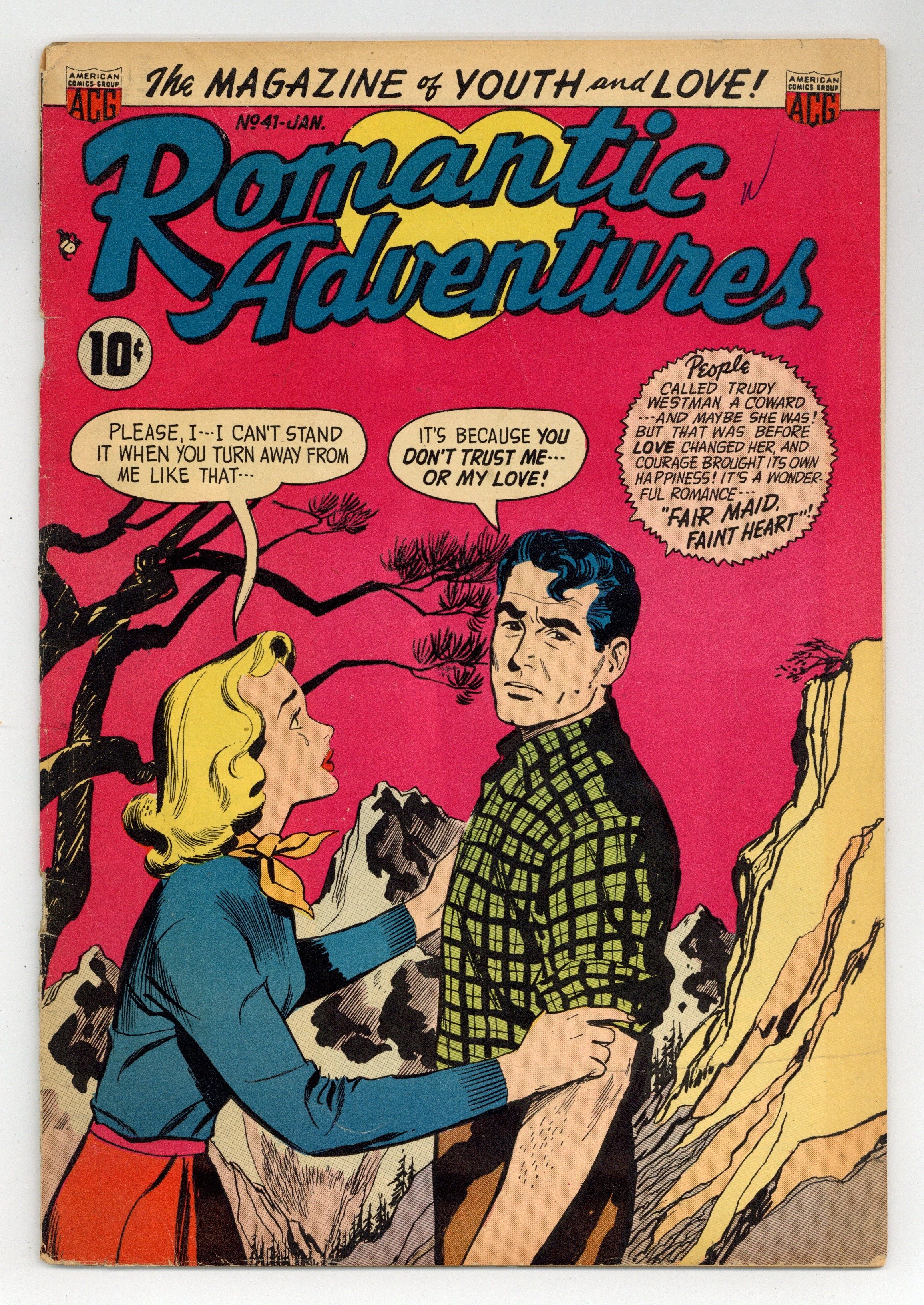 Published Jan 1954 by American Comics Group.$23.50Cover by Ken Bald. Edited by Richard E. Hughes. Art by Shelly Moldoff, Kenneth Landau, Charles Nicholas, Pete Riss, Bill Benulis and Jack Abel. Tales of romance from legendary early independent comics publisher ACG. Trudy lets fear prevent her from finding love; An American doctor falls for a sheltered French countess; Young Polly takes a summer trip as a chance to spread her romantic wings. Fair Maid, Faint Heart; The Countess and I; Big Bad Wolf!; Too Young for Kisses!; Smart Girl; Mender of Broken Hearts. 32 pages, Full Color. Cover price $0.10.