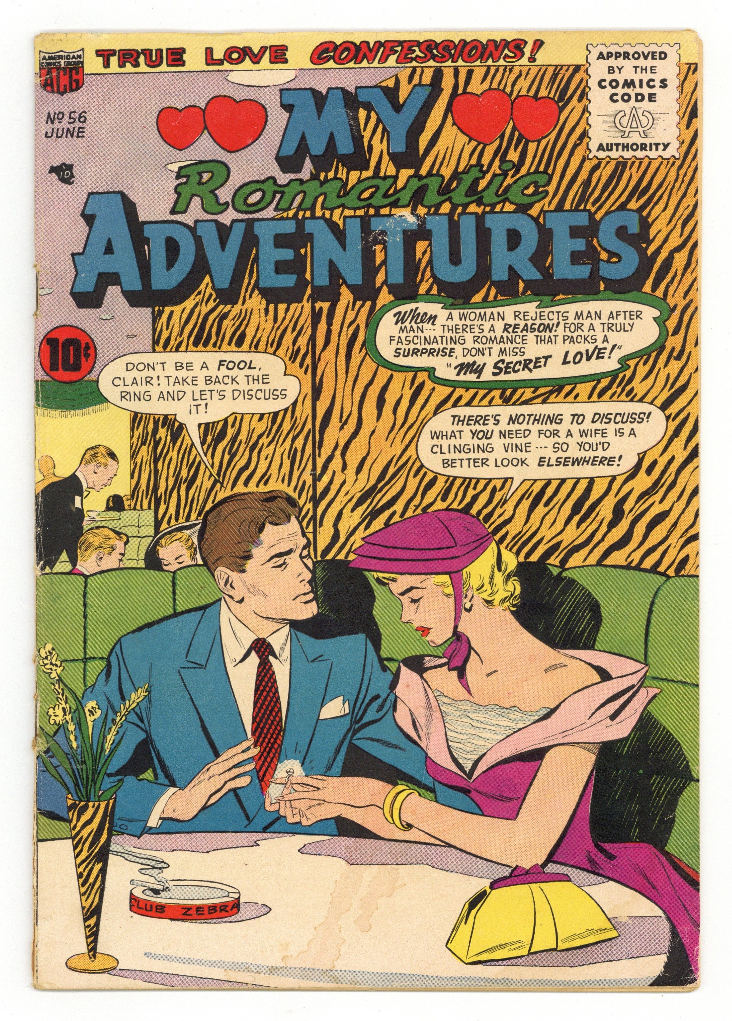 My Secret Love!; a woman rejects a series of potential loves. 100 Ways to Lose a Man! No. 3 filler page, art by Kenneth Landau. Worlds Apart!, art by Harry Lazarus. Little Miss Stiff-Neck! text story. Warden of My Heart!, art by Peter Riss. Optimistic Romance text story. Watch Out For That... Last Minute Spat! He's the Man for You! When Out on a Date filler page. Cover price $0.10.