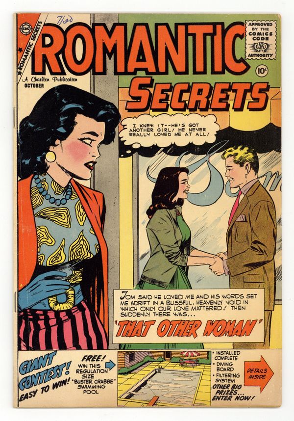 Published Oct 1959 by Charlton Comics Group.$70.00Cover by Vince Colletta. Stories and art by Charles Nicholas, Sal Trapani, and Vince Colletta. Women navigate America's dating landscape in the 1950s and 1960s. Actress Donna finally gets a part in the summer theater show, and falls for the director Vincent to boot, but her fiance is ready for her to quit acting and get married. Glenda's wallflower roommate Nancy falls for Glenda's latest boyfriend Mark. Beth joins the clean-cut motorcycle gang called the Bronc Busters so she can ride behind Johnny, but secretly she hates motorcycles. The Right Man; My Foolish Heart; Nice! Nice! Nice!; A Man For Mary; The Wild One; That Other Woman. 32 pages, Full Color. Cover price $0.10.
