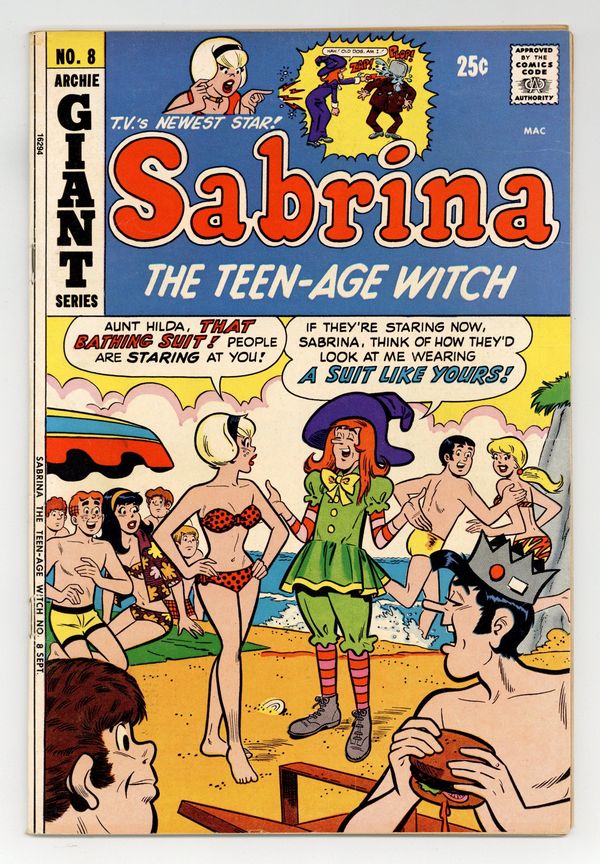 Cover pencils by Stan Goldberg, inks by Joe Sinnott. Zap Trap starring Sabrina, script and pencils by Al Hartley, inks by Joe Sinnott; Sabrina zaps Ethel and makes all the boys abandon their girlfriends to fight over her. Family Affair starring Sabrina, Archie, and Jughead, script by Frank Doyle. Going To the Dogs starring Sabrina, script and pencils by Al Hartley, inks by Joe Sinnott. Bride and Gloom starring Sabrina script by Frank Doyle. 52 pgs. $0.25. Cover price $0.25.