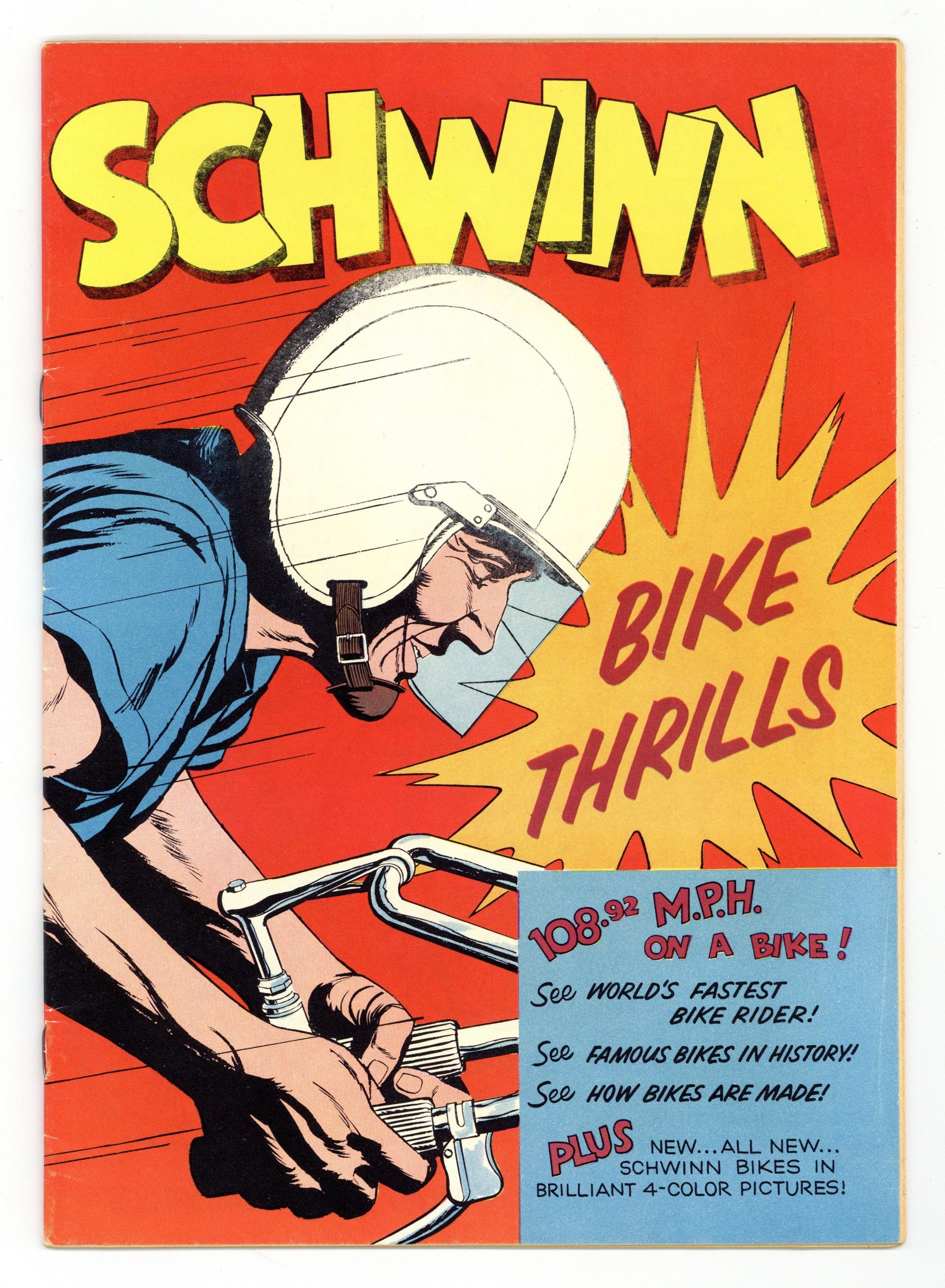 Schwinn Bicycle Book, 108.92 Miles Per Hour on a Bycycle (1959 edition) is a promotional comic book distributed by the Schwinn Bicycle Co. Full color, 28 pages, slick paper stock, 7-in. x 10-in..