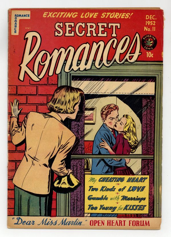 Original, pre-Code romance stories from Canadian publisher Superior, often featuring a crime or mystery element and plentiful good-girl art. Lois is torn between soldier Larry and defense contractor Jeff - but the story takes a left turn with the discovery of a spy ring. Sisters Betsy and Ellen get into a feud over dating older men, but one of the sisters is secretly married to boot. Bert discovers that his new wife Mary has inherited her father's gambling problem. My Cheating Heart; Two Kinds of Love; Too Young for Kisses; Gamble With Marriage. 32 pages, Full Color. Cover price $0.10.