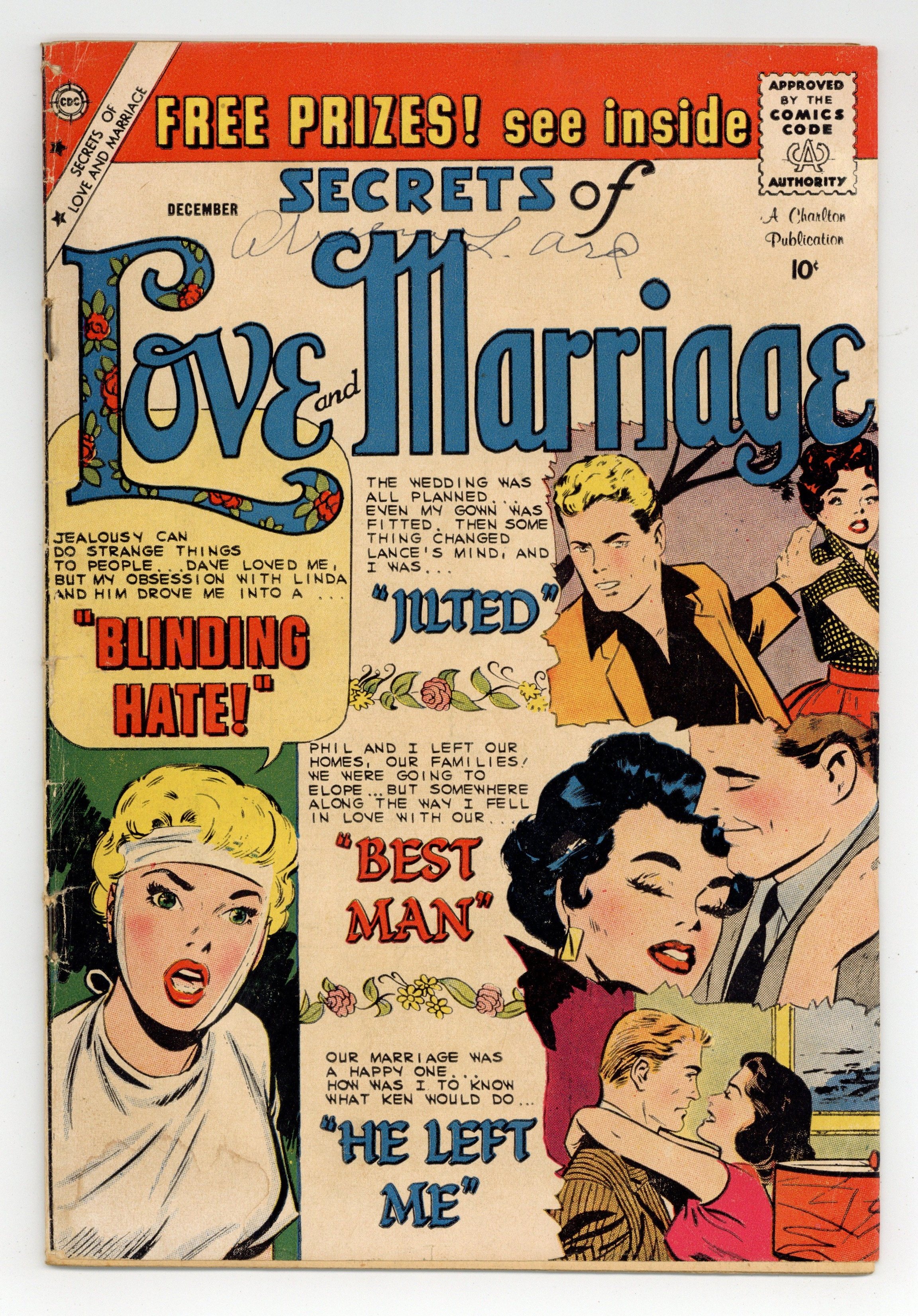 Published 1959 by Charlton Comics Group.$69.00Cover by Vince Colletta. Stories and art by Joe Sinnott, Charles Nicholas, Vince Alascia, Dick Giordano and Vince Colletta. Newlyweds find that while love solves some problems, others require negotiation. Dave's girlfriend has a deep jealousy that leads to an obsession with Linda and a foolish race to a crossing with a freight train. Karen plans to elope with Phil, but the chaotic ride to the judge proves Phil's not the one, as she falls in love with Bob, their best man. This story features art by future Fantastic Four legend Joe Sinnott. On the eve of their wedding, Christy gets a telegram from Lance that he's married someone else. Best Man; Lovers' Quarrel; Blinding Hate; He Left Me; Lost Love; No Question of Food; Tears of a Fool; Jilted! 32 pages, Full Color. Cover price $0.10.