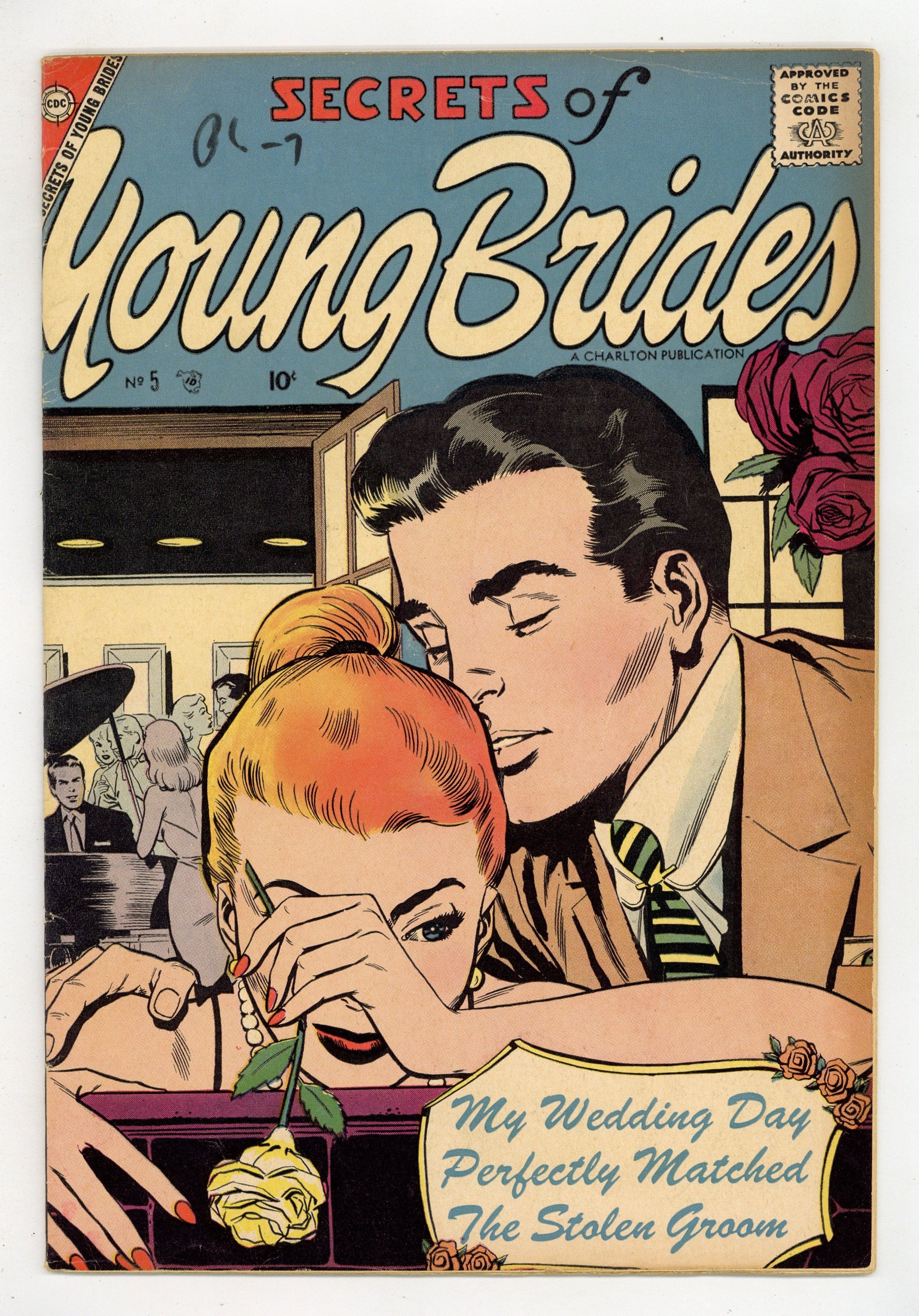 Cover inks by Dick Giordano. "My Wedding Day"; Just before her wedding, Marge confesses that she fears her fiancé Fred will be disappointed when he discovers the real "shy, quie" Marge; Marges father helps her peek at Fred, who is admitting to his best man that he is afraid Marge wont love him when she finds out hes a "plain, humdrum guy!" "Cruel," pencils by Bill Molno, inks by Vince Alascia; Helen marries gambler Nick; After the ceremony, they are abducted by gangster Al, who claims Nick owes him a lot of money. "Lazy Bones" text story. "The Stolen Groom," inks by Jon D'Agostino; Vicki, frustrated with her mooching longtime boyfriend Artie, becomes engaged to Don; However, Don and Vickis roommate Edna fall in love. "Follow Your Heart," inks by Vince Alascia; A car hop has a crush on Stan, who comes to the drive-in every day in a fancy car and with a different girlfriend; She never responds to his flirtatious come-ons, fearing her heart will be broken. "The Ideal Couple," inks by Vince Alascia; Secretary Verna marries her boss John, but a year later thinks hes having an affair with his new secretary; She demands a divorce. John introduces her to Alice, his secretary: a middle-aged woman. 36 pgs., full color. Cover price $0.10.