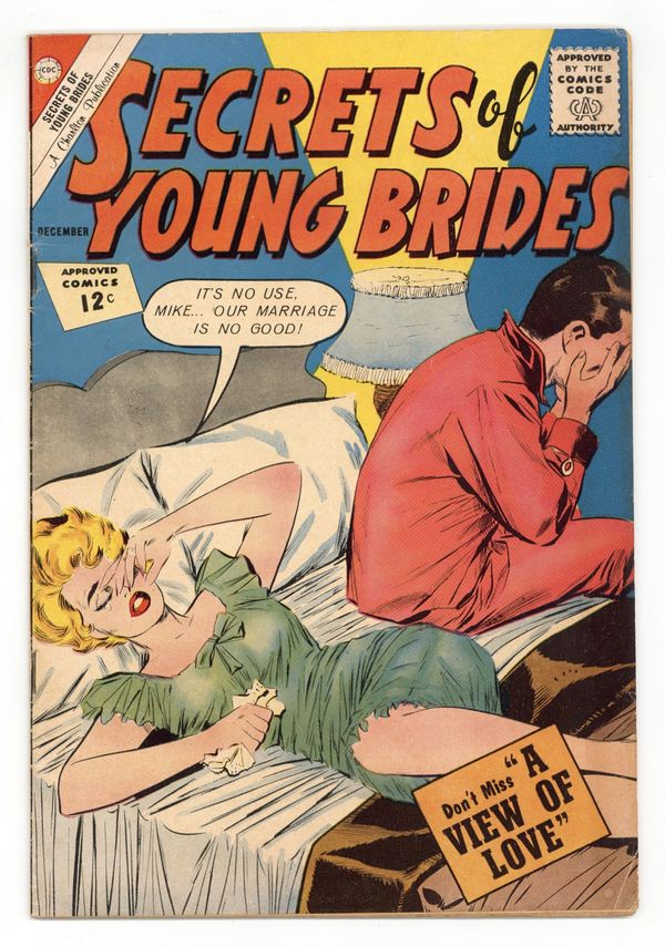 Cover by Vince Colletta. Stories and art by Vince Colletta and others. Young couples face the romance and angst of married life after the honeymoon. Janet marries Mark after a whirlwind romance, then realizes she doesn't have as much in common with him as she does with old flame Ken. Joyce marries traveling construction engineer Mike and goes on the road with him in their 1960s RV, but it isn't the sort of married home life she'd always imagined. Norma is drawn to handsome Des, but she has clear ideas of what she wants in a husband, and Des doesn't fit into them. Mistaken Marriage; Never Speak of Love; The Total Man; View of Love. 32 pages, Full Color. Cover price $0.12.