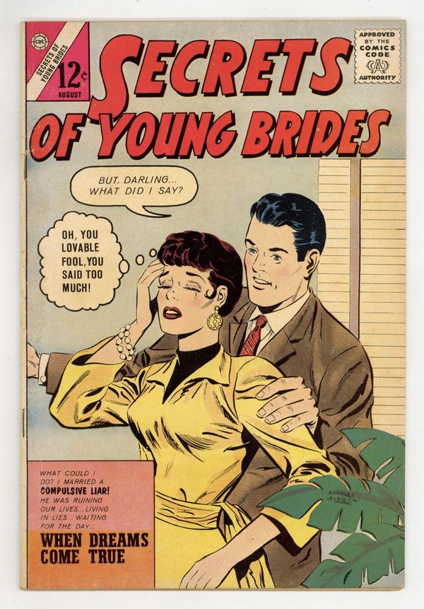 Published 1962 by Charlton Comics Group.$24.00Cover by Charles Nicholas and Vince Alascia. Stories and art by Norman Nodel and Bill Fraccio. Young couples face the romance and angst of married life after the honeymoon. Bob's new wife Ellen wants to control his behavior, and he's not okay with that. Gracie tries to cover up an accident involving her old flame Ace from her young and wild years. Beth realizes that new husband Doug is a compulsive liar. Old-Fashioned Girl; Echo of Guilt; Disowned; Renner Versus Carolli; When Dreams Come True. 32 pages, Full Color. Cover price $0.12.